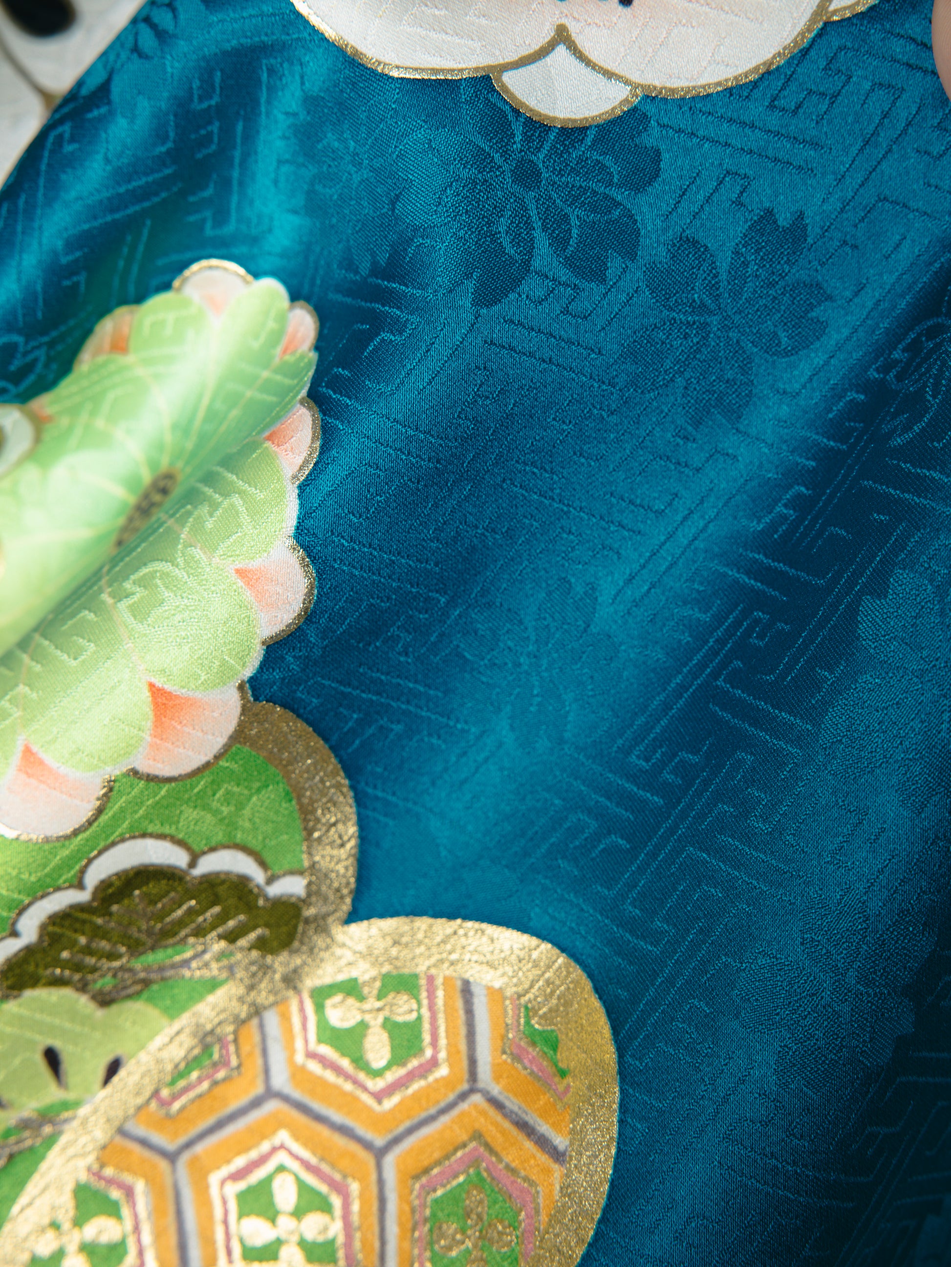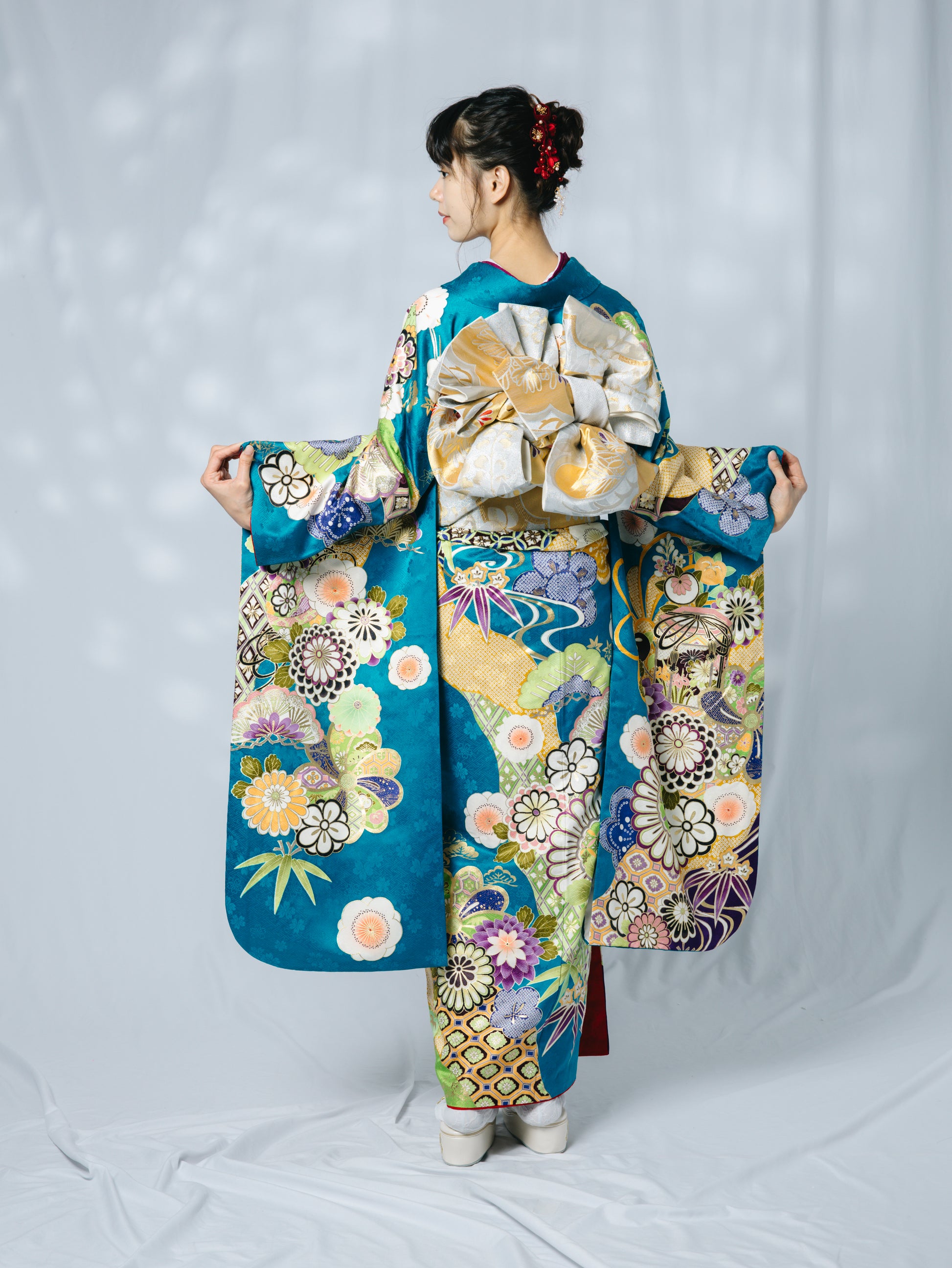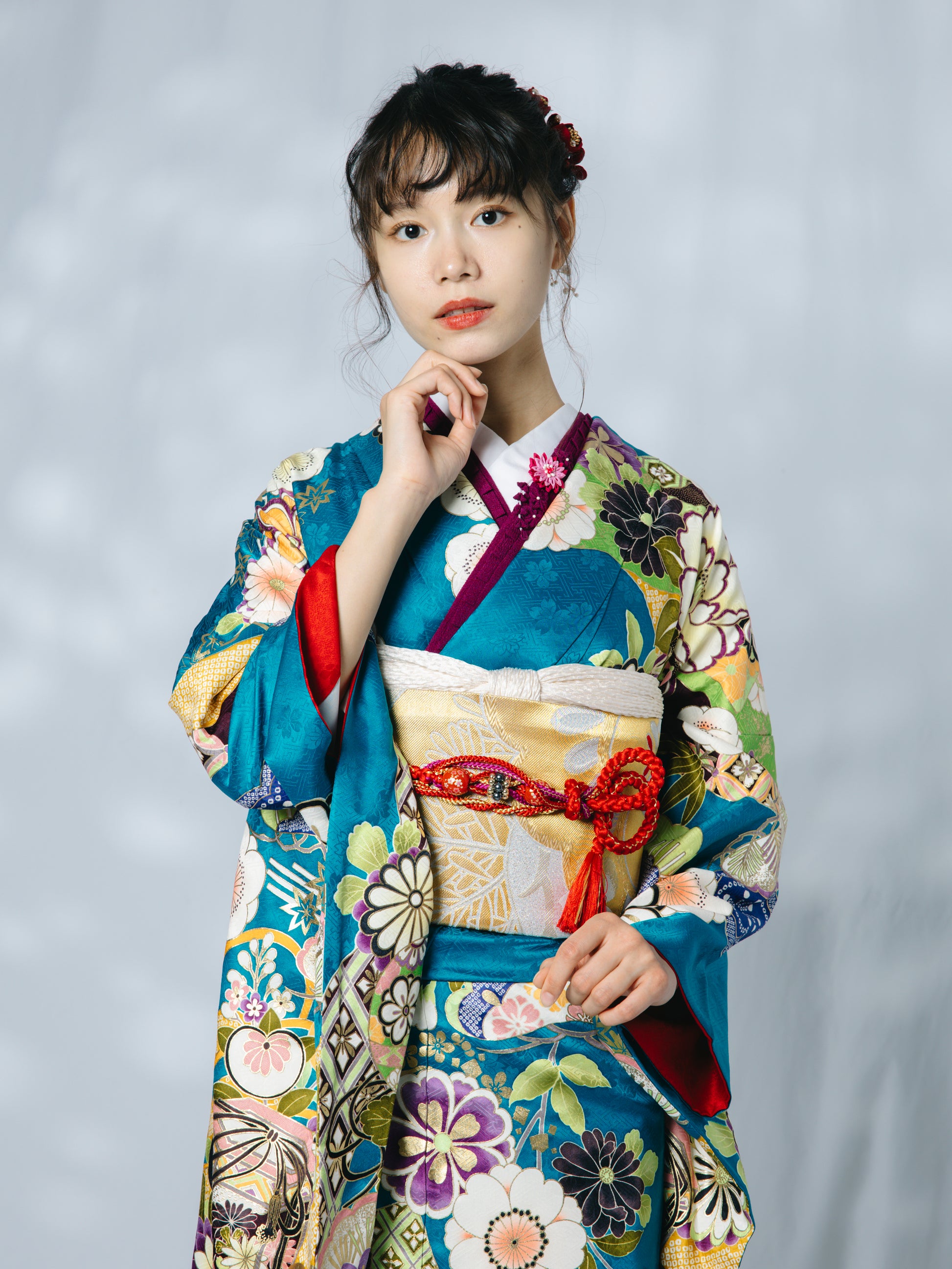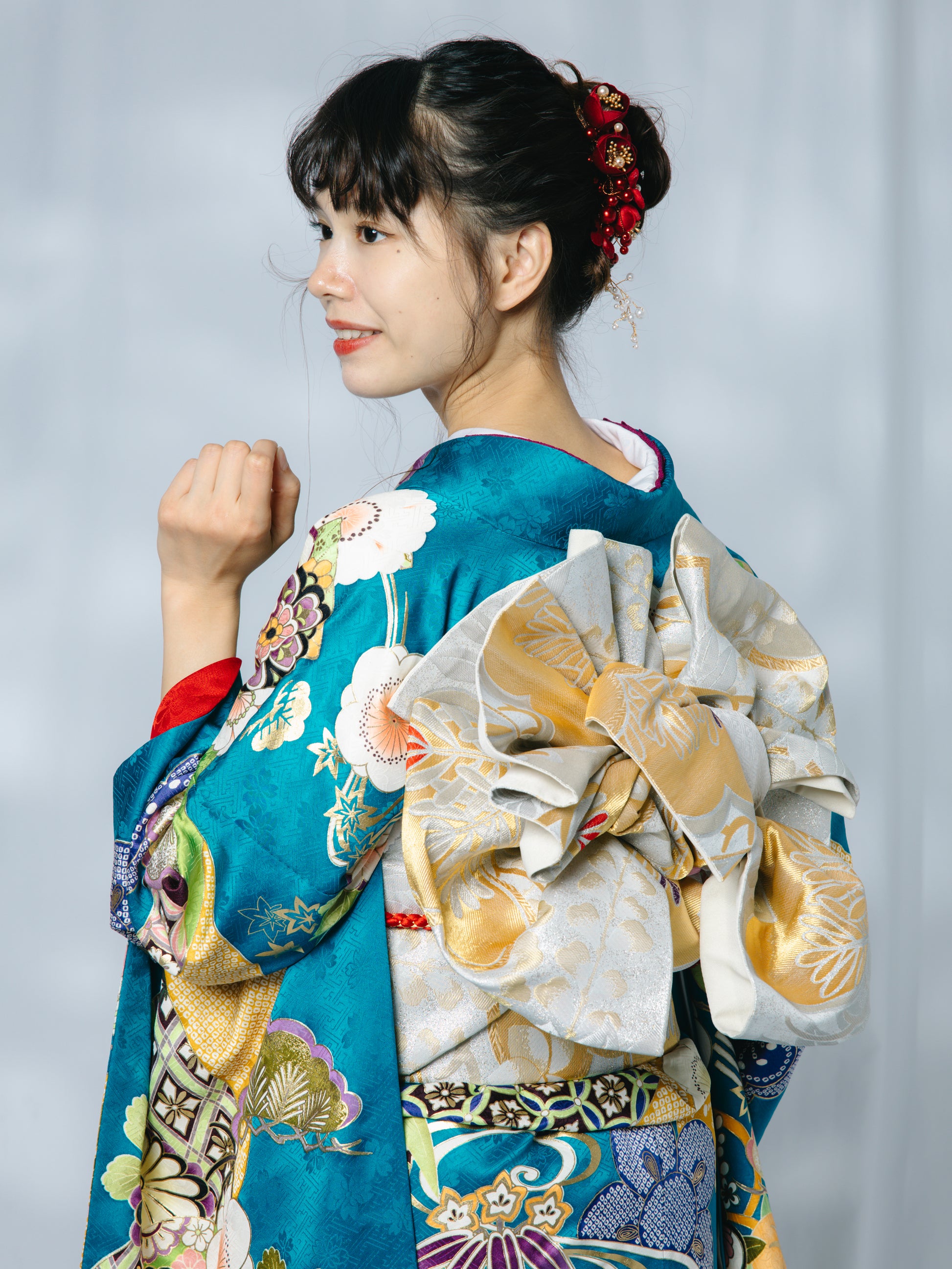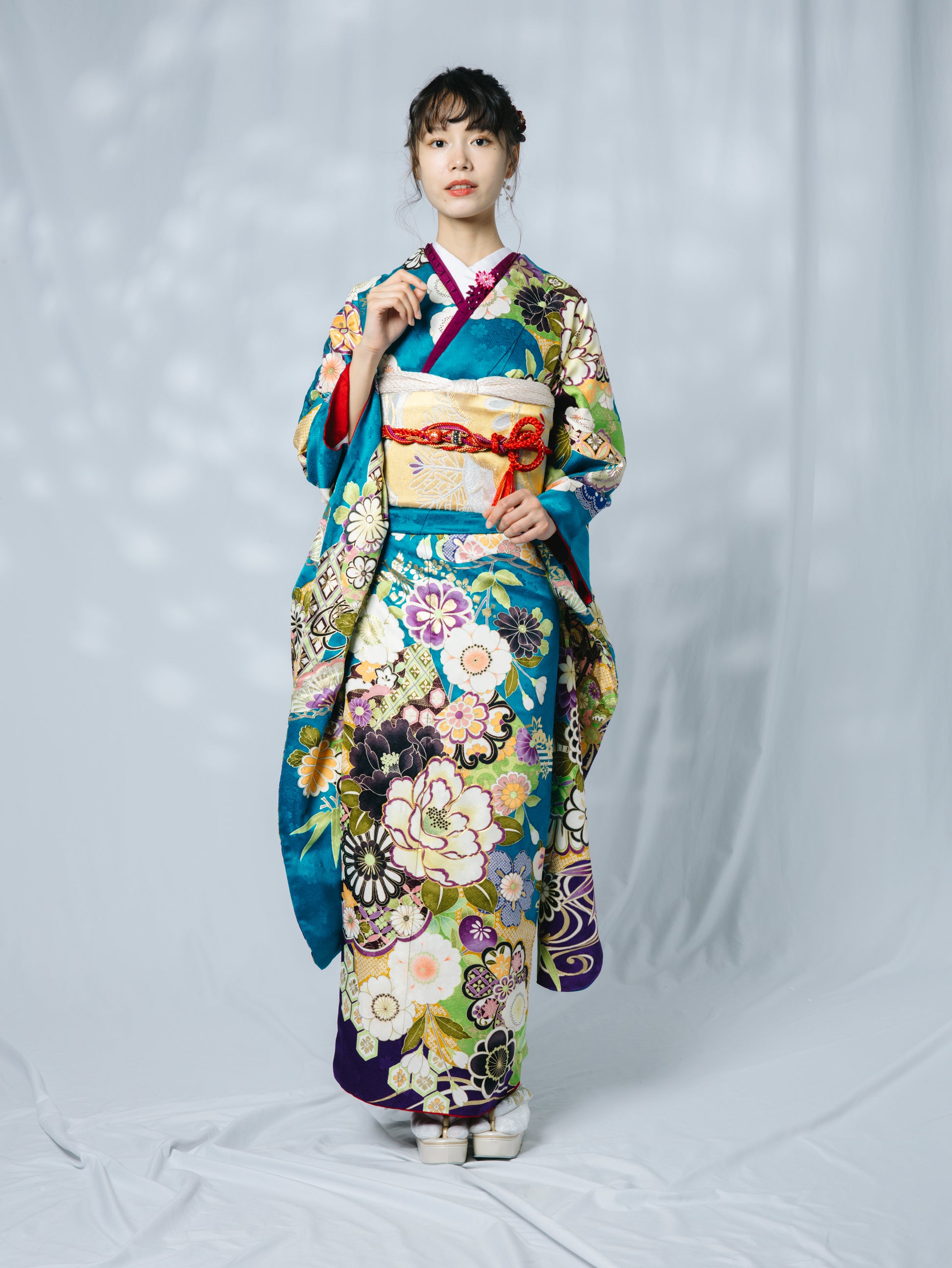 青緑の振袖に紫や赤の小物がアクセントのコーディネートに