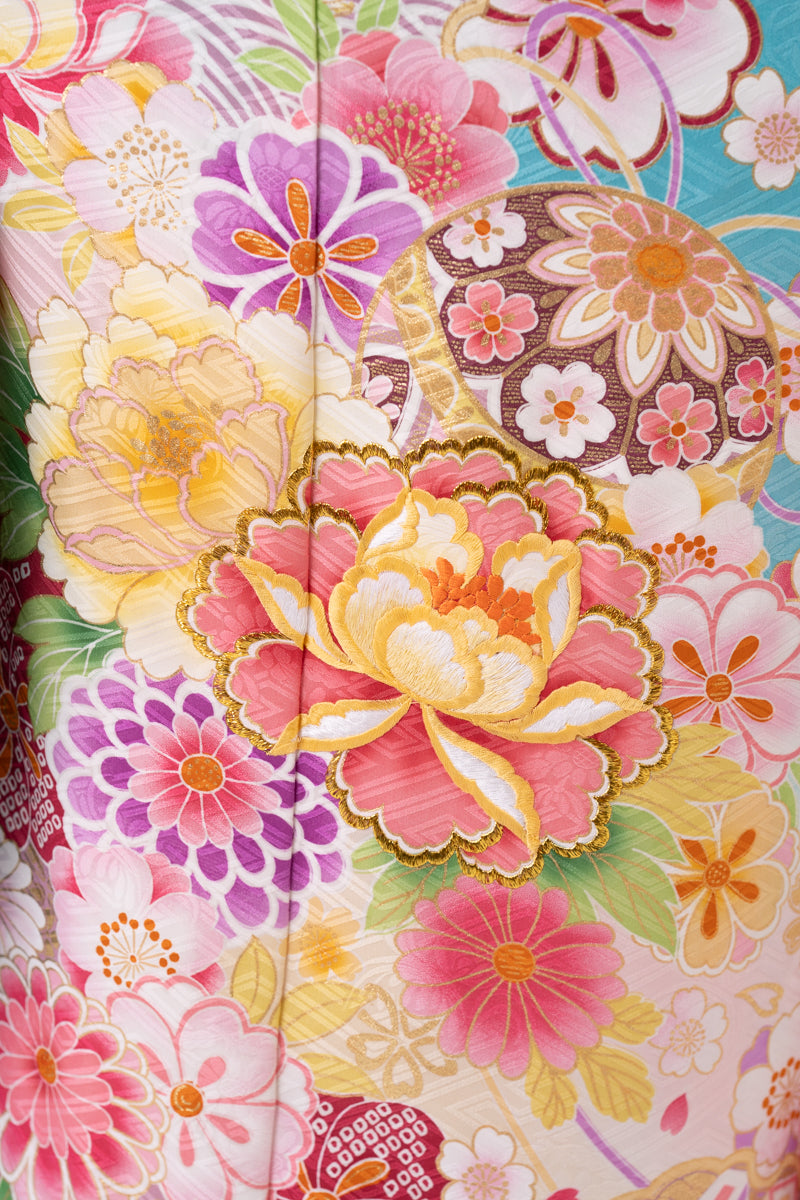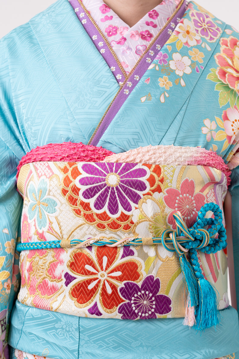 ピンクの牡丹柄に爽やかなスカイブルーで華やかな印象に。