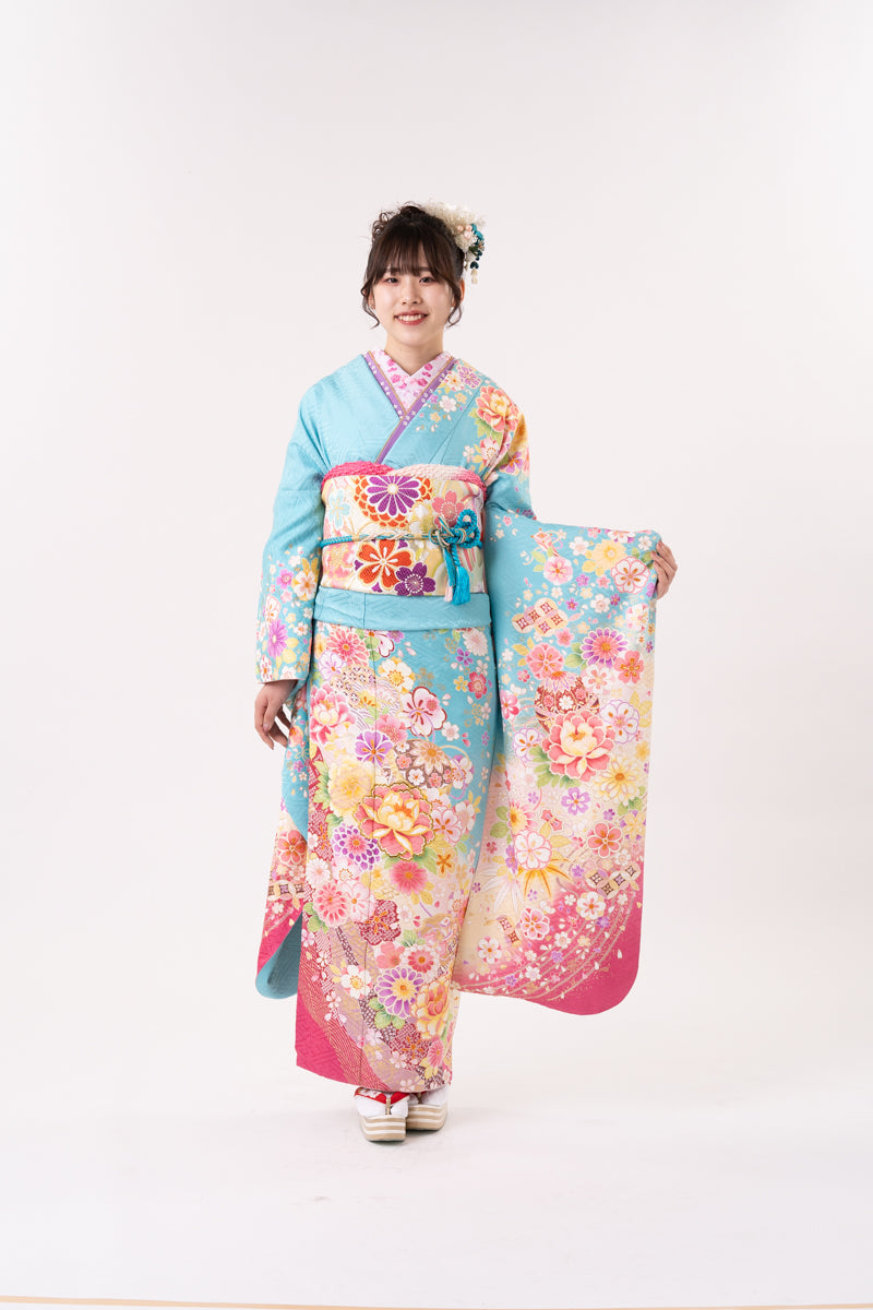 水色地 ピンク牡丹柄 正絹振袖【105】