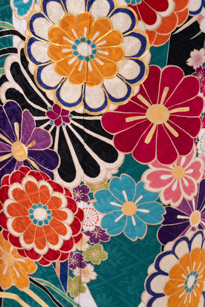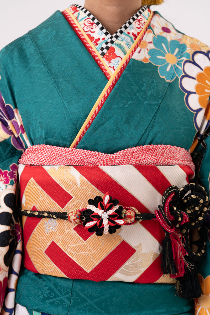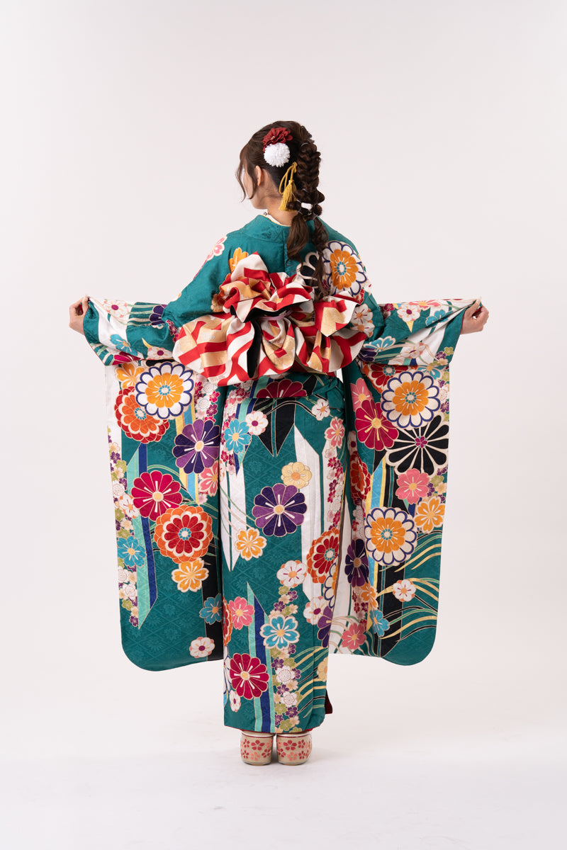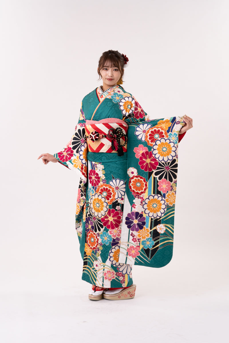 エメラルドグリーンにハイカラ模様で個性的なお振袖。小物は赤色で統一感のあるコーディネート。