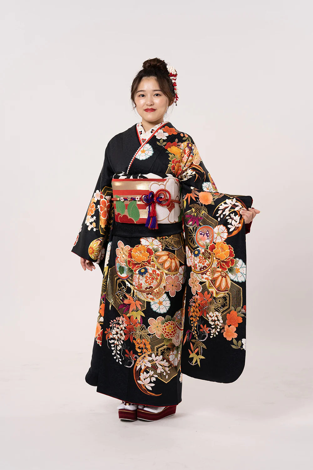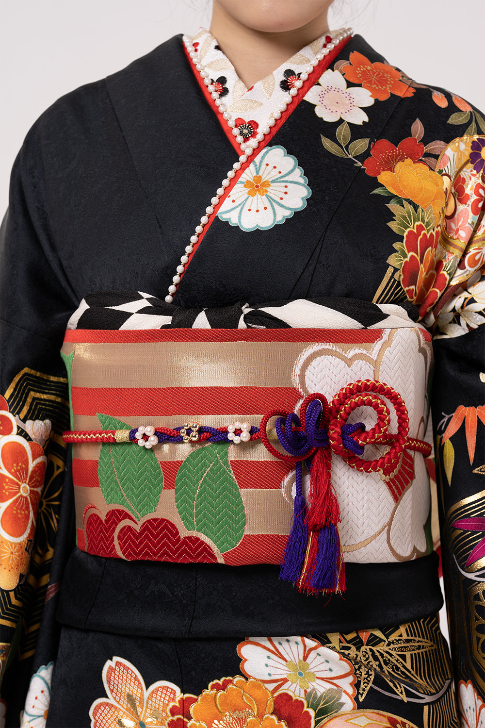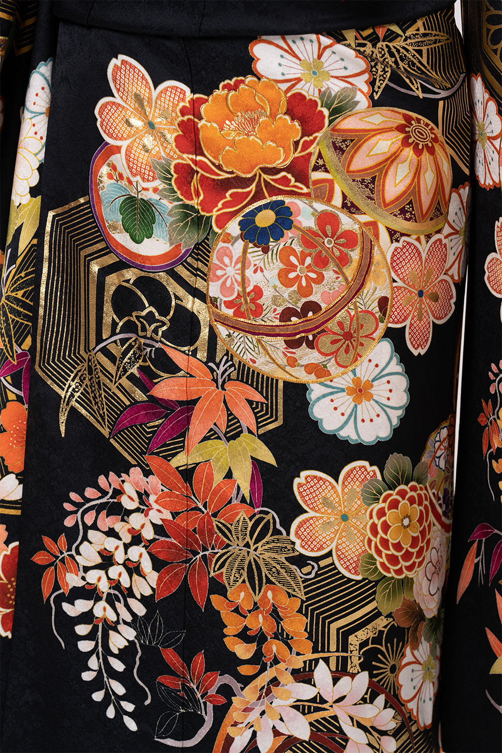 黒地に金色や朱色で描かれた亀甲柄や鞠柄が映える一枚です。
