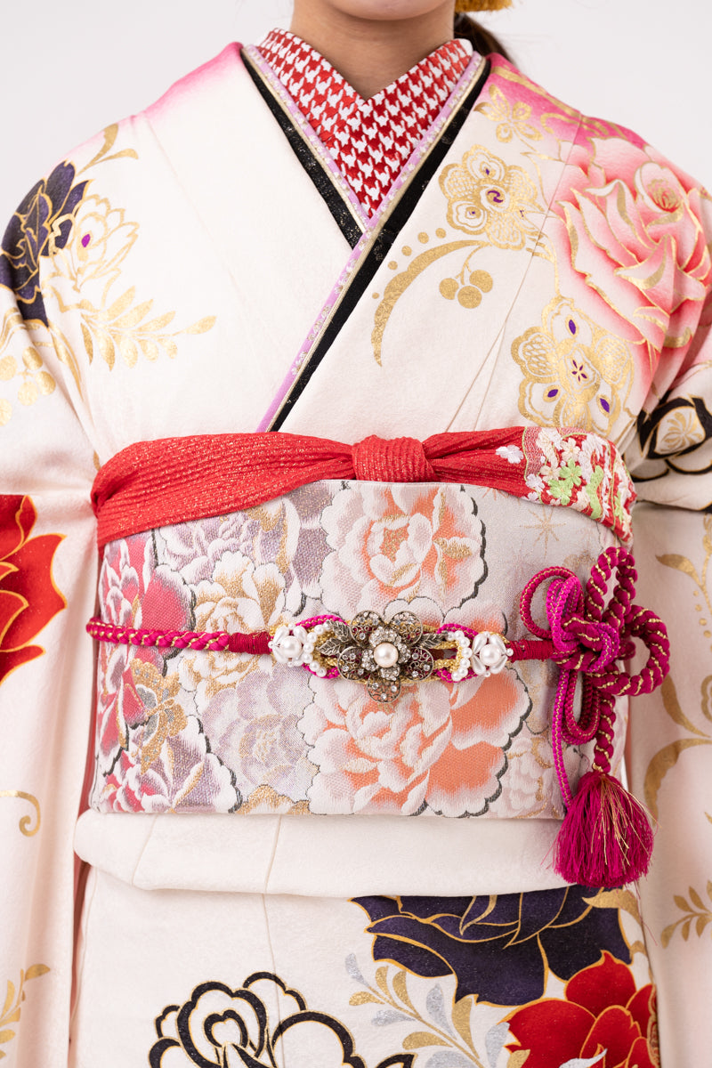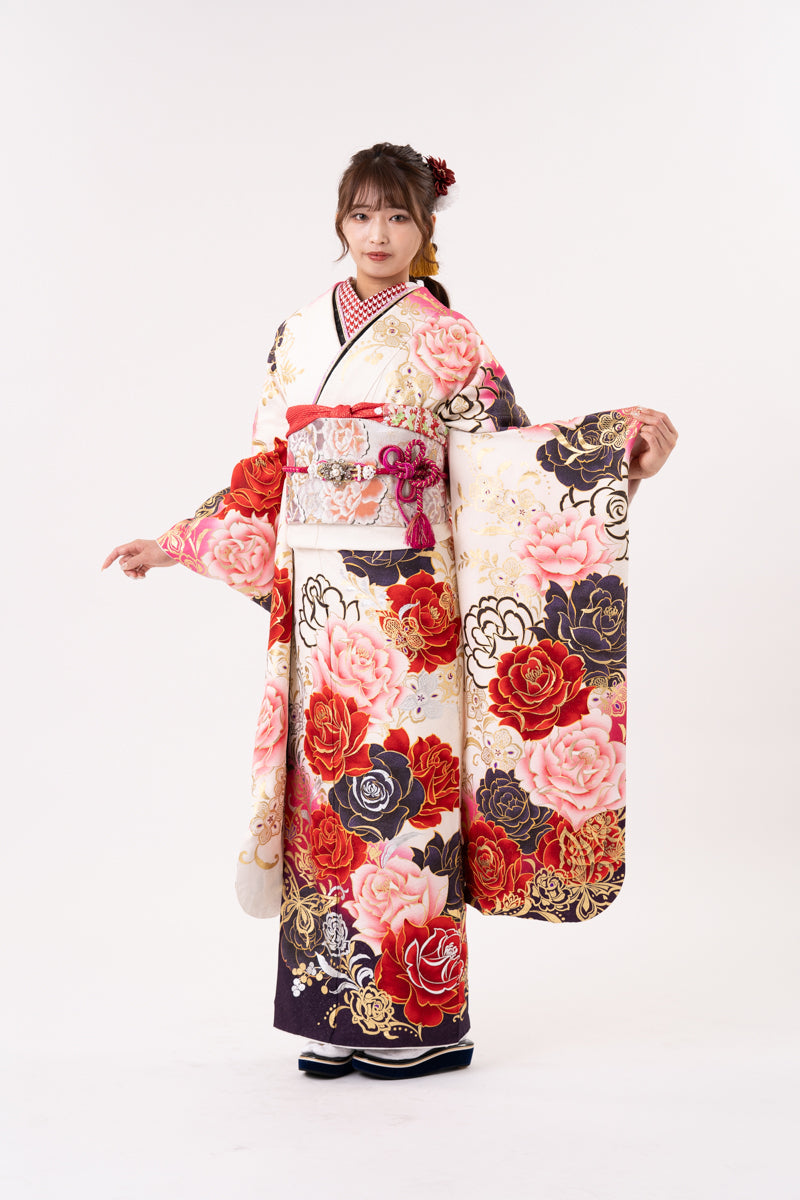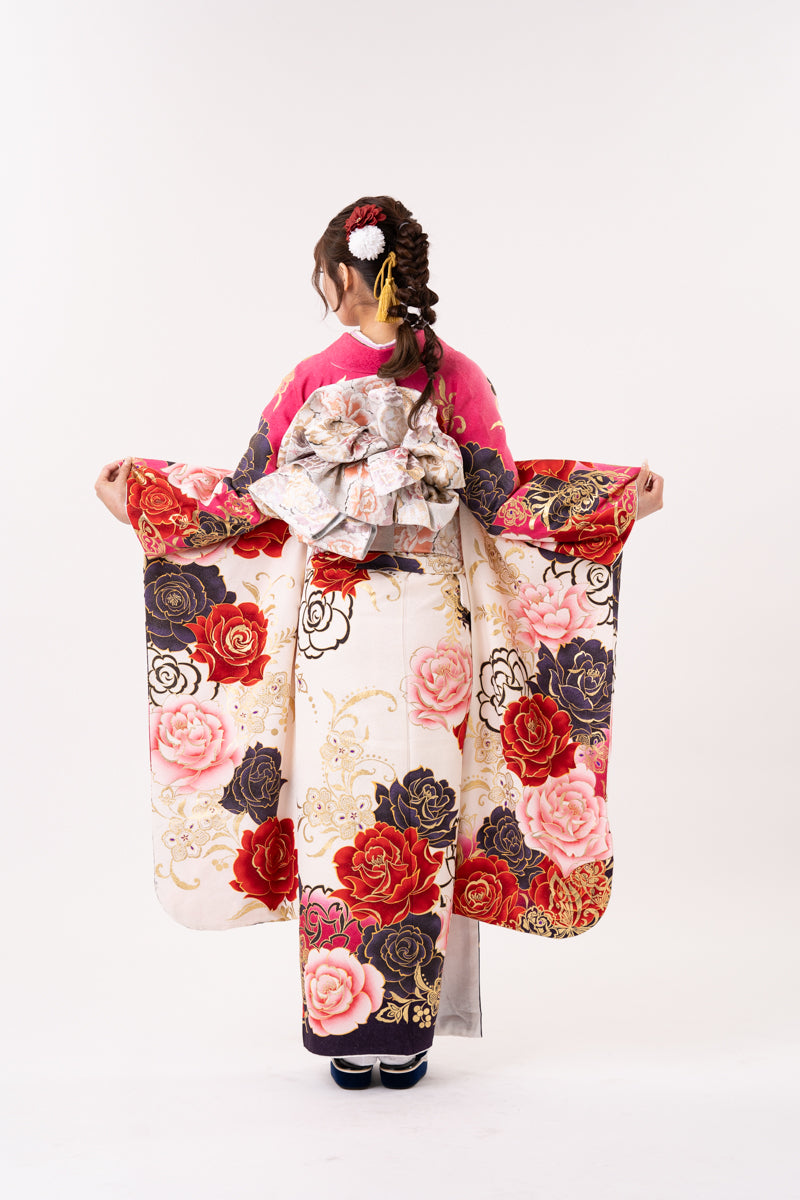 白地とピンクの染め分けで、薔薇刺繍が施されたお振袖。小物には黒を入れることで大人っぽく今どきなコーディネートに。