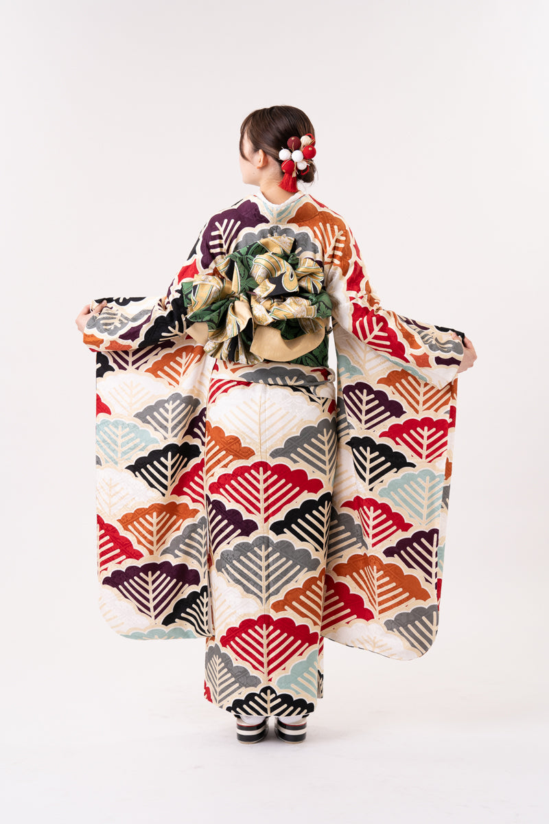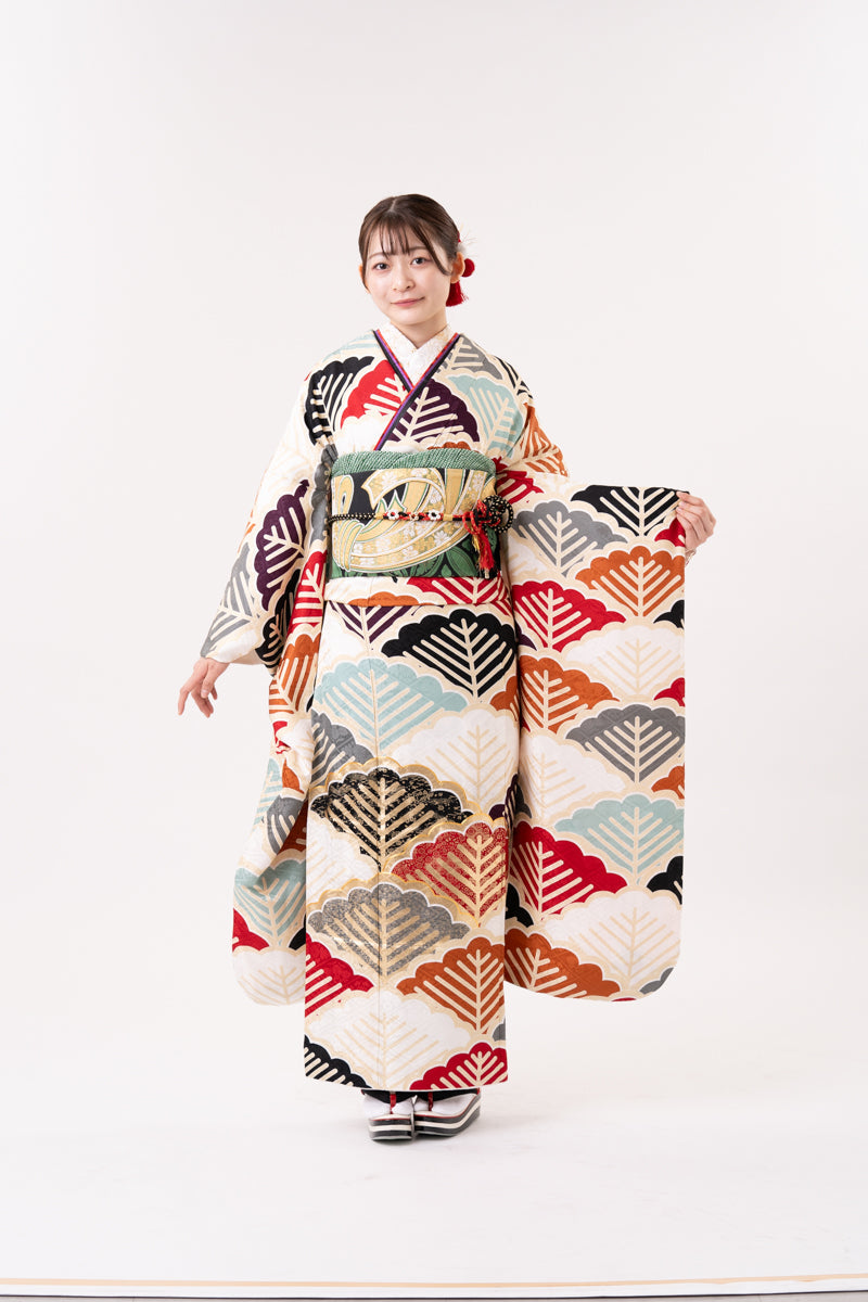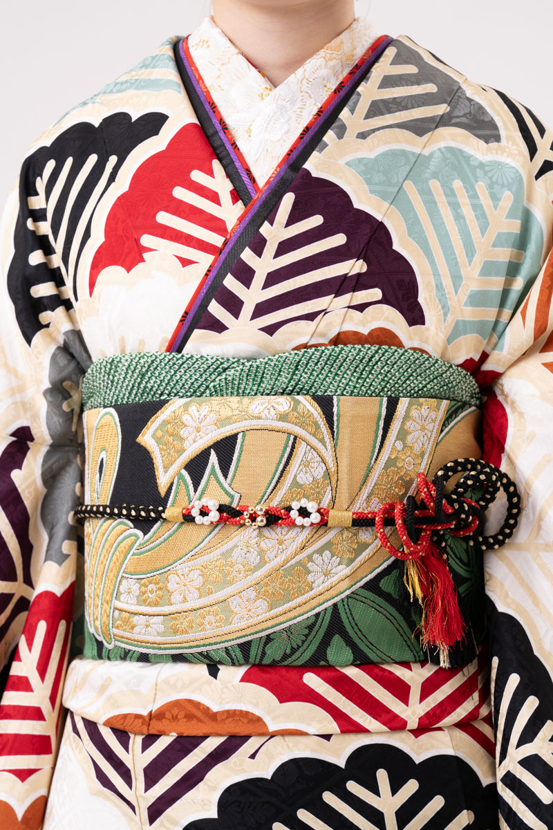 くすみカラーの松柄が並んだ個性的なデザインのお振袖。差し色を入れることでメリハリアップ。