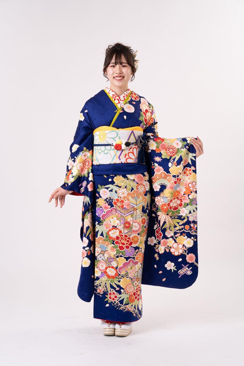 青地に古典の柄が映える振袖。吉祥文様が成人式らしさを引き立てる一着。