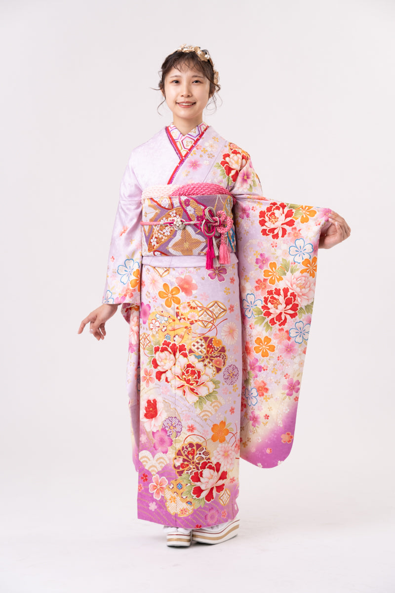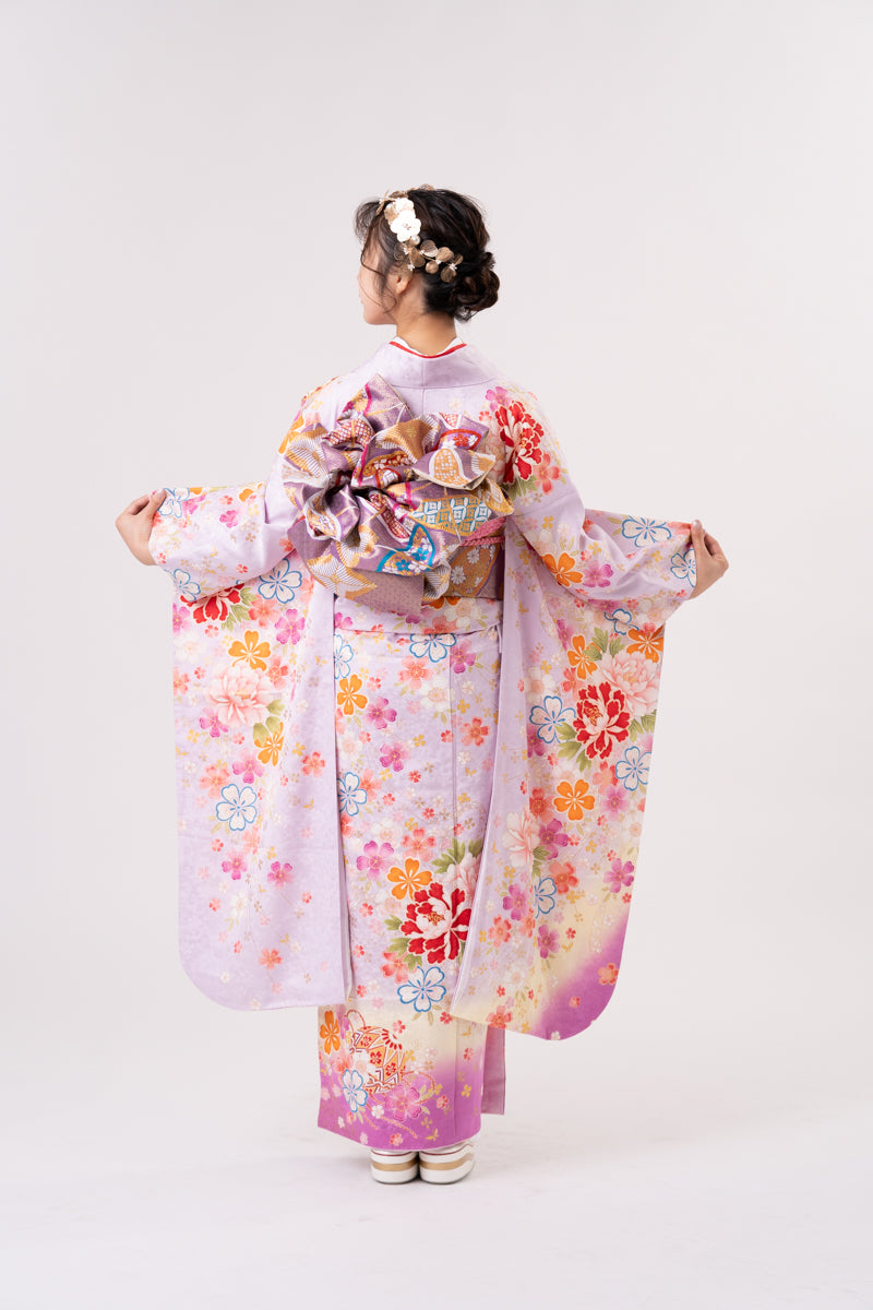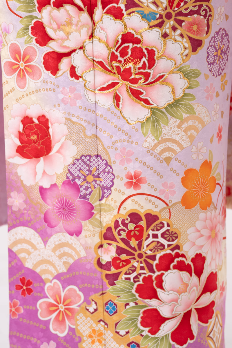 ラベンダー地 牡丹・雪輪柄 正絹振袖【131】
