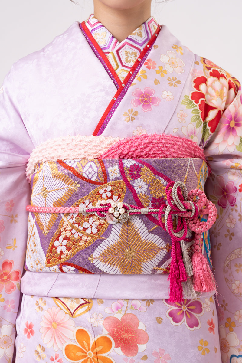 ラベンダー地に古典的な絵柄が描かれたお振袖。小物はピンクでまとめることで可愛らしい印象に。