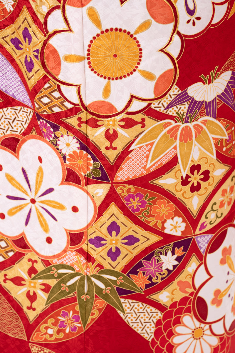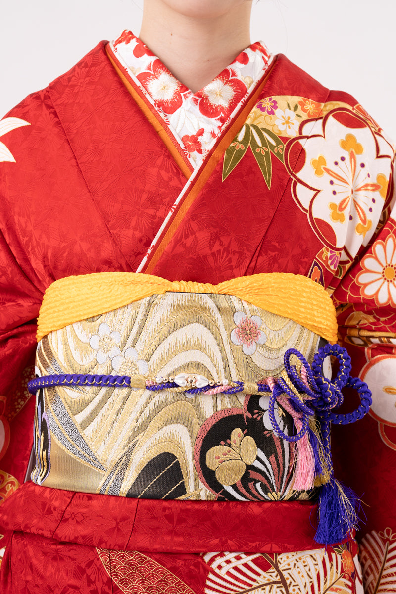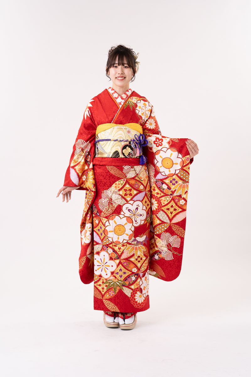光沢感のある赤地に、白色の梅が美しい一枚。オレンジの小物を使用した可愛らしいお振袖。