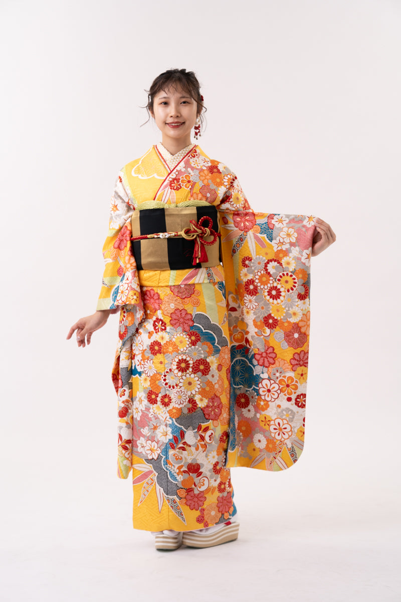 黄色地 青雲柄 正絹振袖【146】
