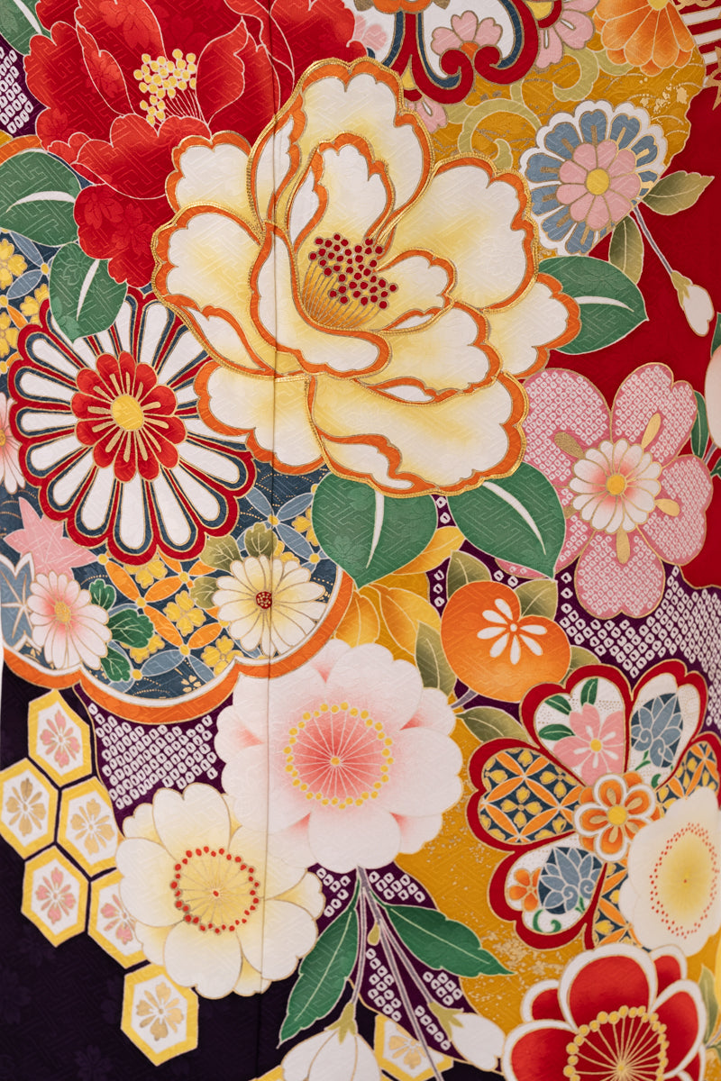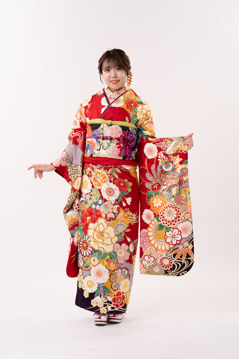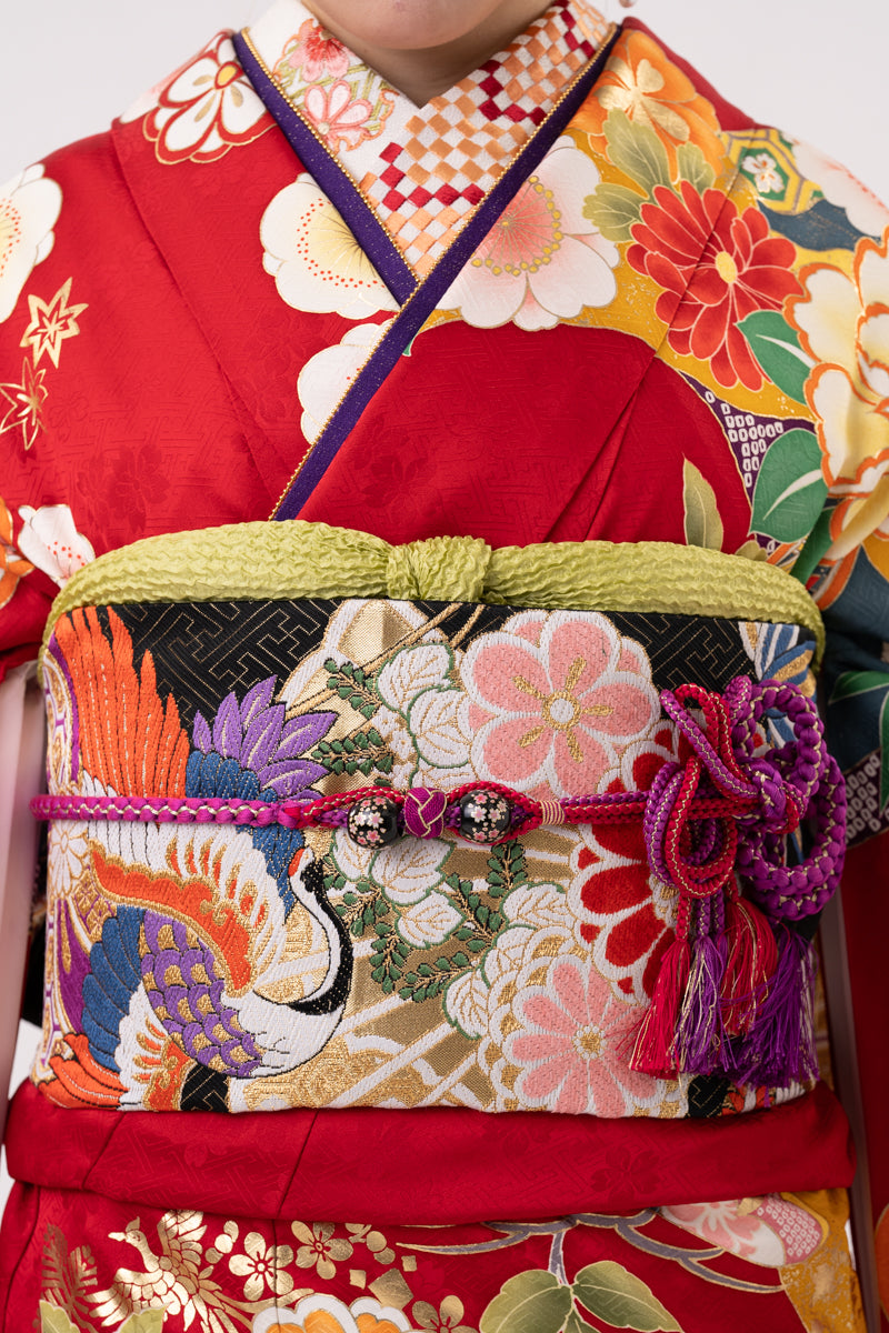 赤地に鮮やかなお色味の花があしらわれたお振袖。帯は黒、帯締めには紫で大人っぽい印象に。