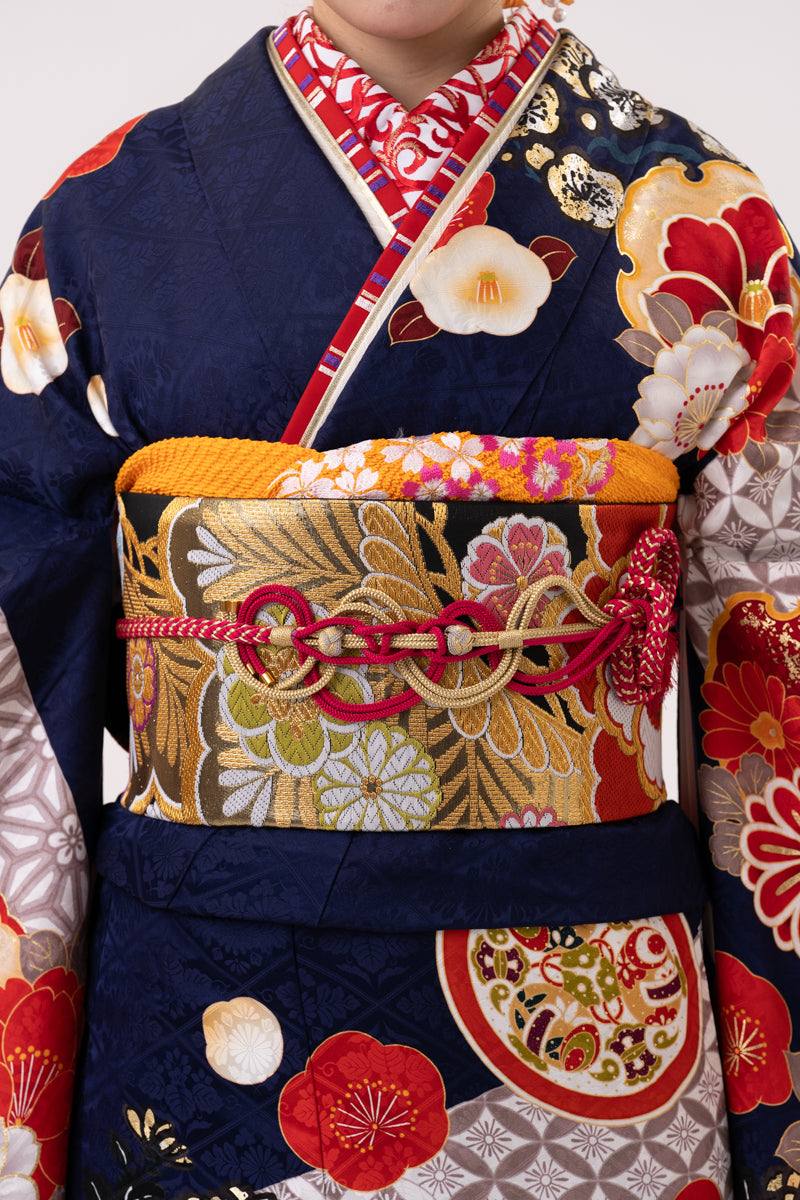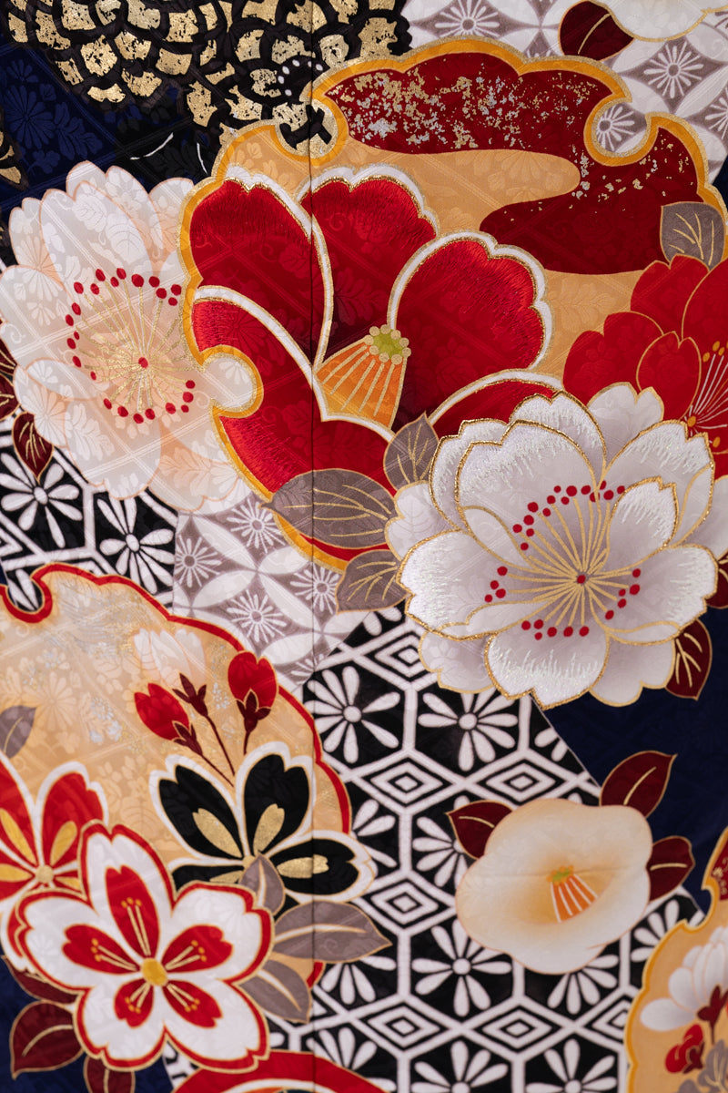 紺地に大胆に描かれた牡丹のお花が印象的な一枚です。グレーの染め分けも美しく、大人っぽく着ていただけます。