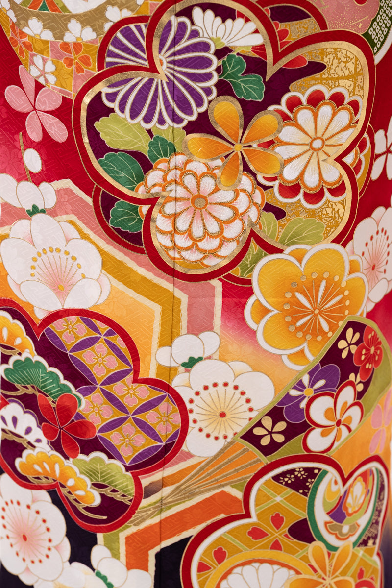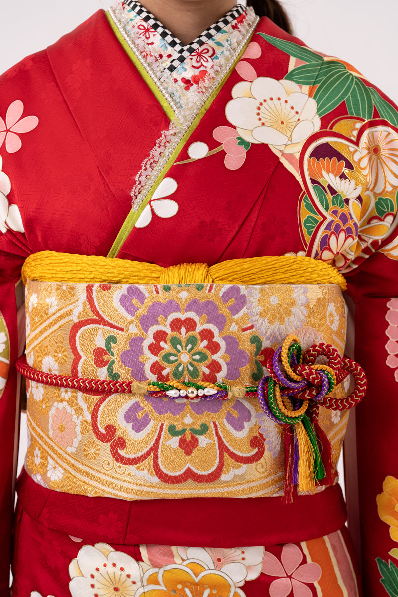 定番の赤地に金の帯合わせの中にも、衿元にはレースを入れ、豪華でかわいらしくコーディネートしています。