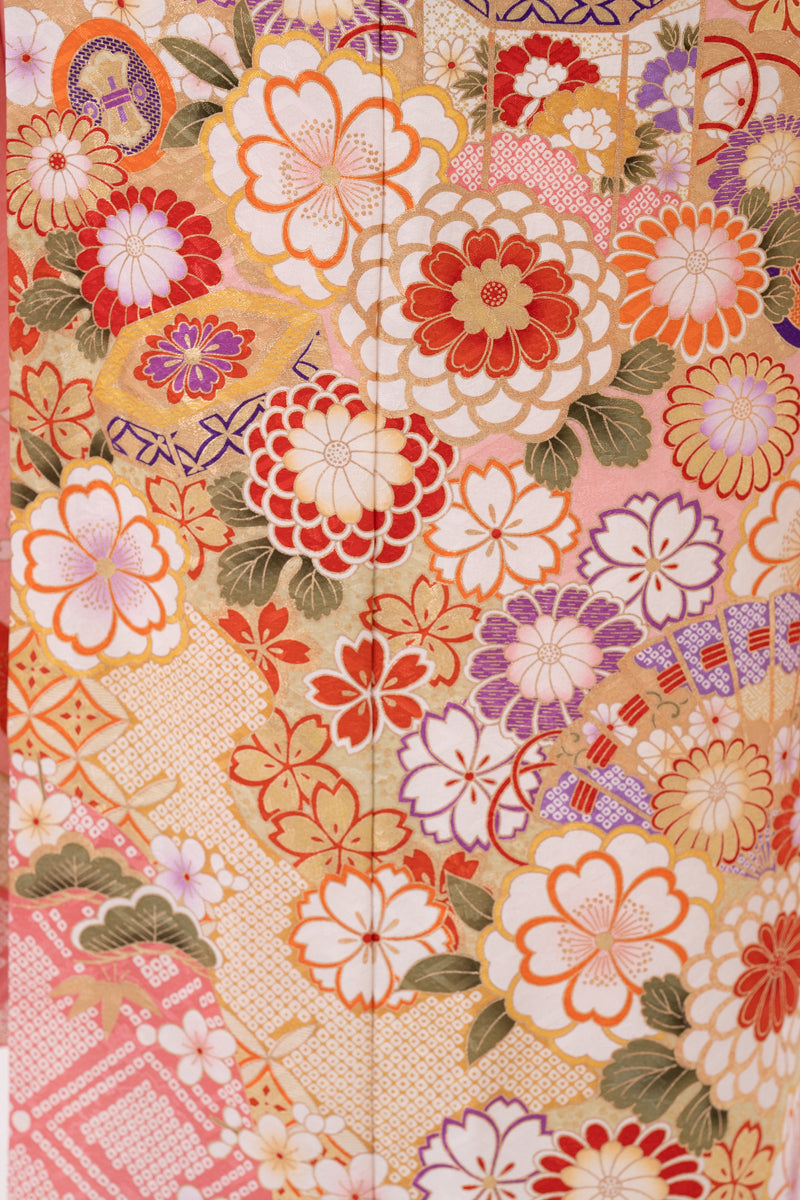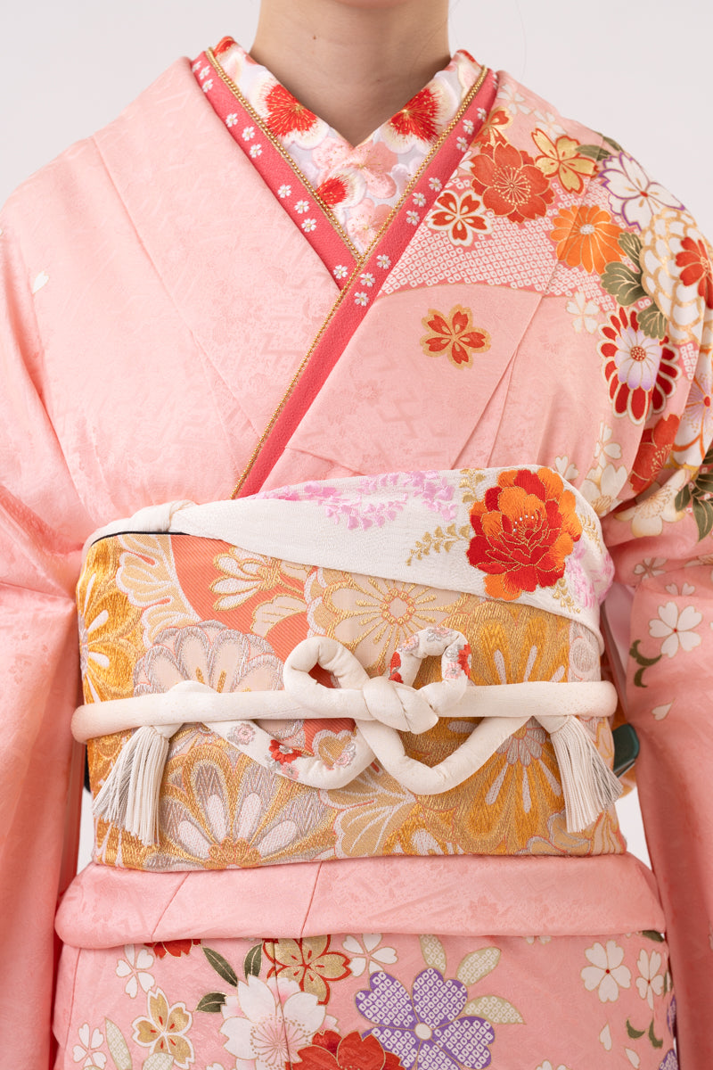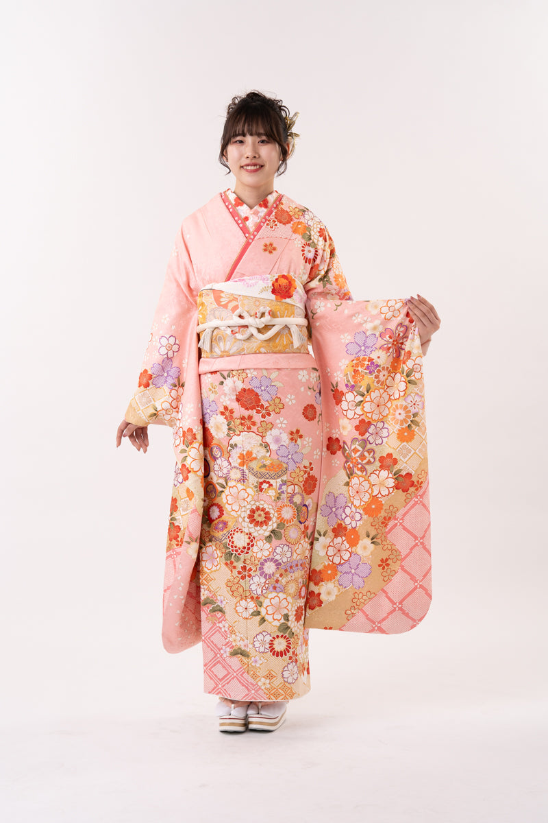 前身の金彩加工が美しい振袖です。全体的にピンクと白色でコーディネートした上品で美しい振袖一式です。