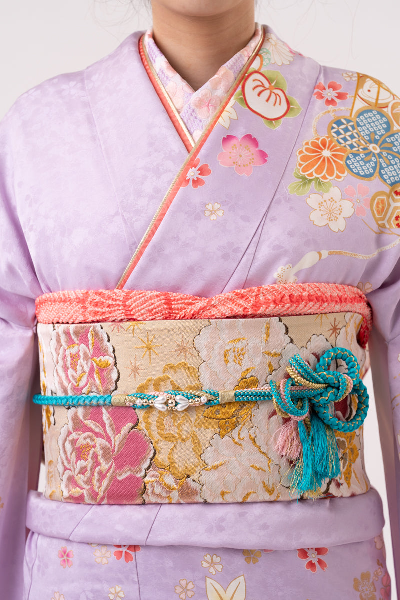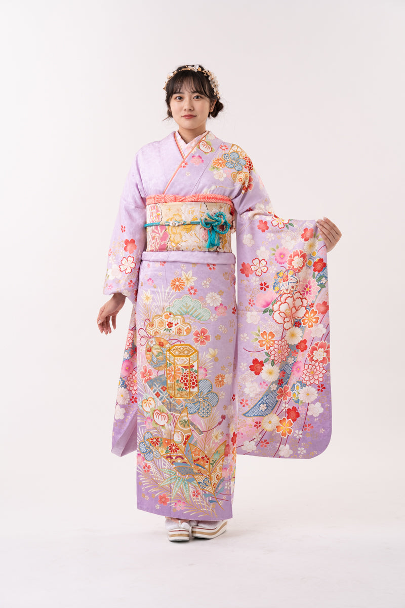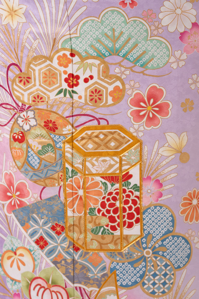 珍しいラベンダー色のお振袖。前身には貝桶や鞠柄など古典的な美しい絵柄が描かれています。