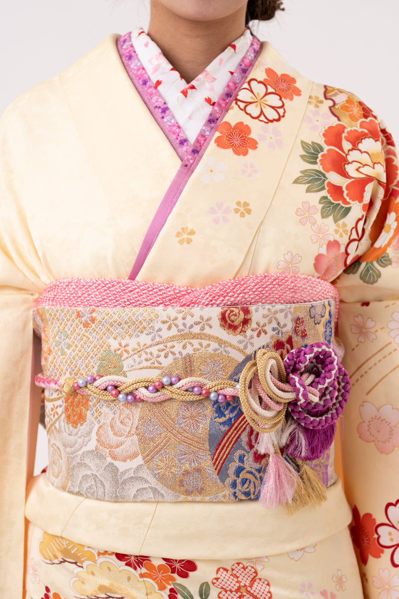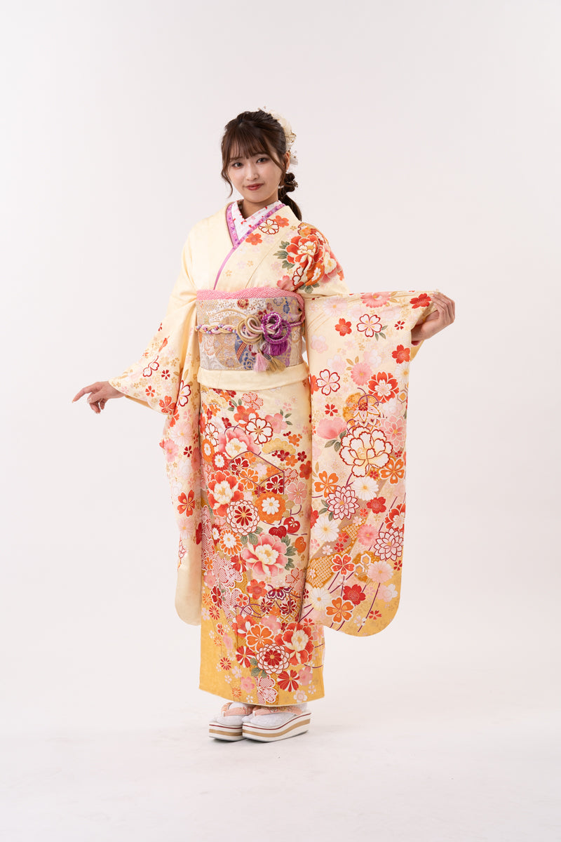 柔らかい印象の薄色地に、小花がらの花々が描かれた可愛らしい振袖です。帯も白ベースで柔らかくコーディネートしています。