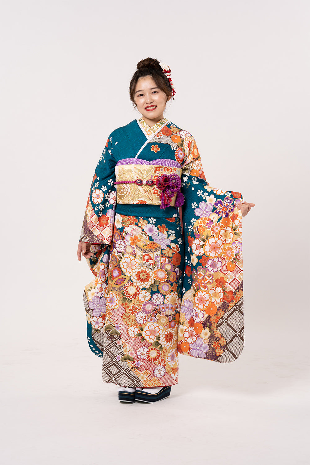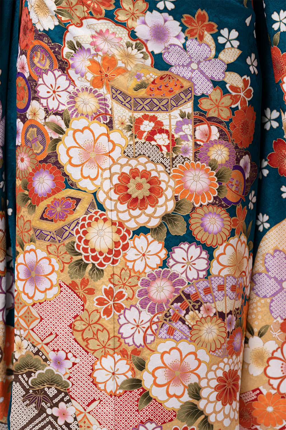 青緑のお着物に小花柄が描かれた上品な一枚です。