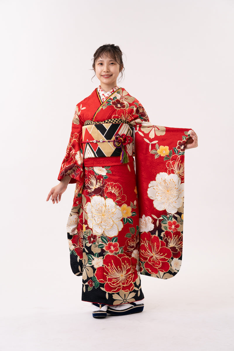 赤地に牡丹と椿の柄と裾へ向けての黒ぼかしがカッコよく決まるお振袖。
