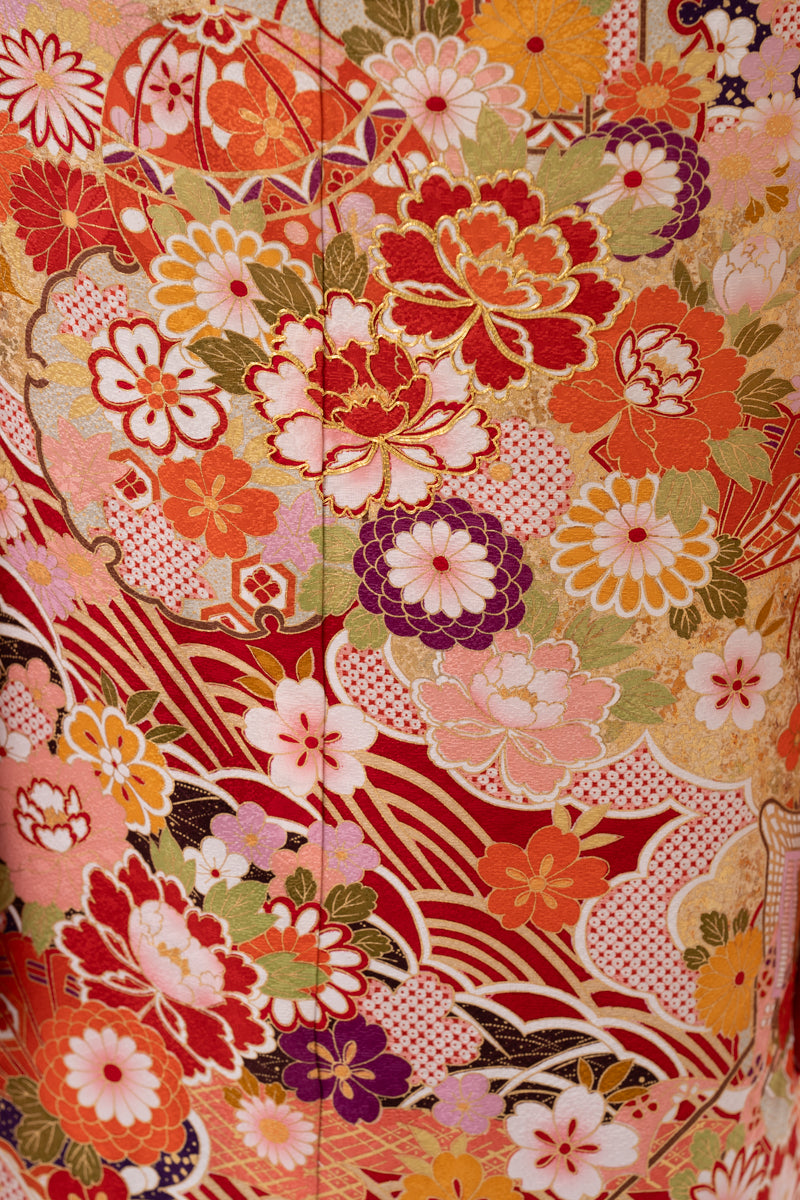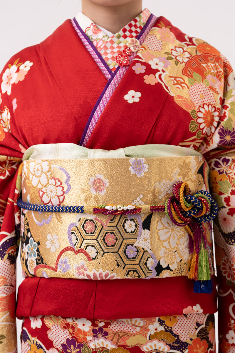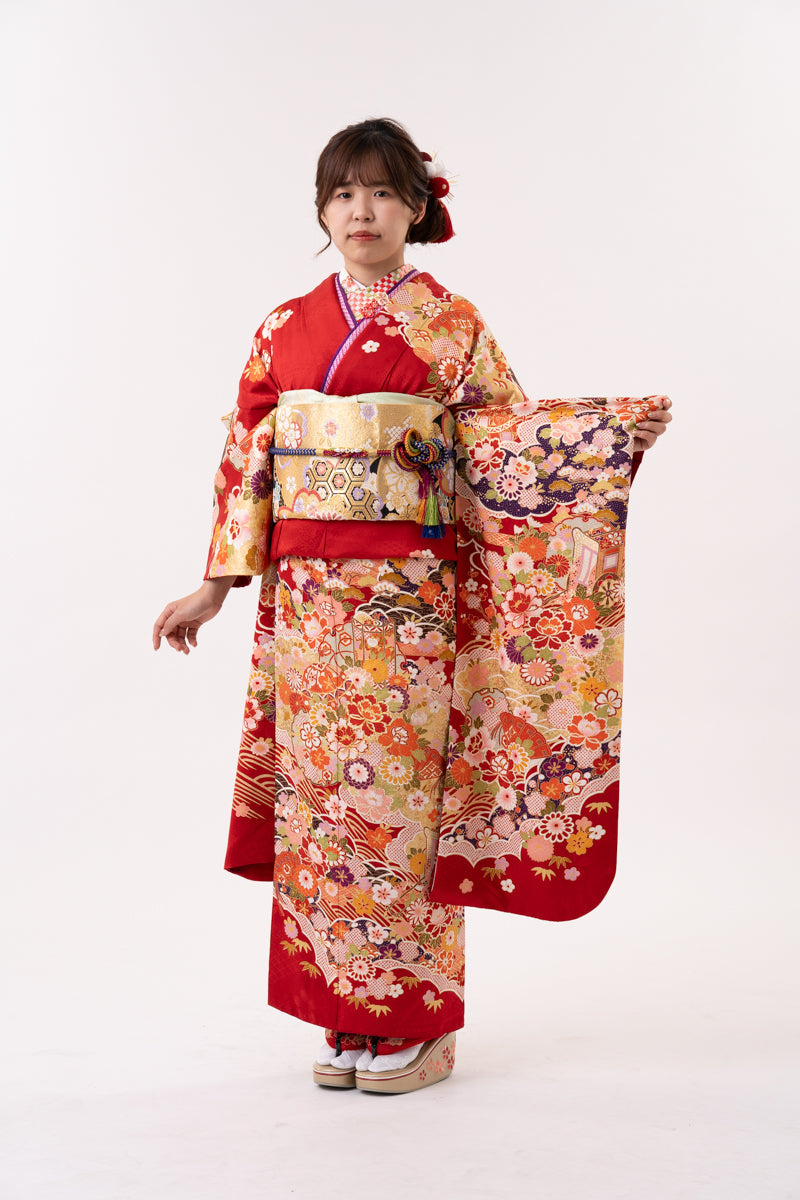 赤地にゴールドが引き立つお振袖。小花柄で上品に大人っぽい印象の一枚。