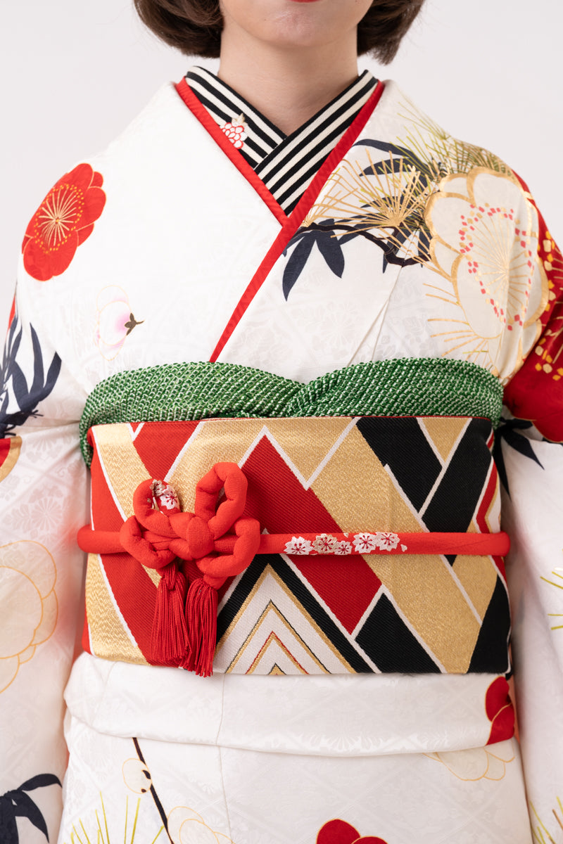 白地に松竹梅、裾へ向けての黒ぼかしでカッコよく決まるお振袖。帯と衿元のストライプで人と差をつけるコーディネートに。