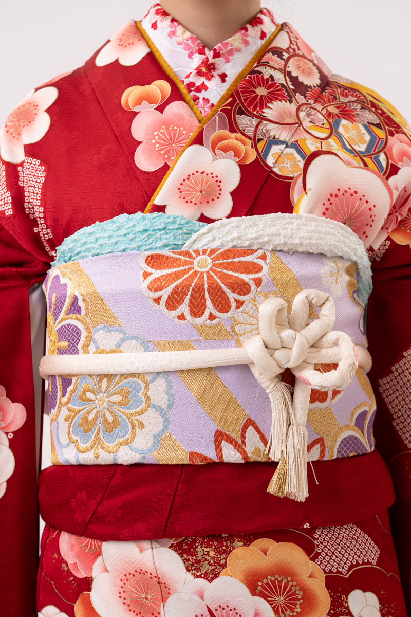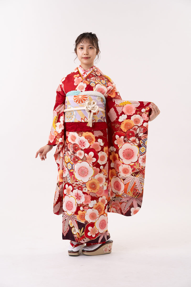 赤地のお振袖にピンクの梅がたくさん散りばめられた可愛いお振袖。差し色で水色を入れて優しいコーディネートに。