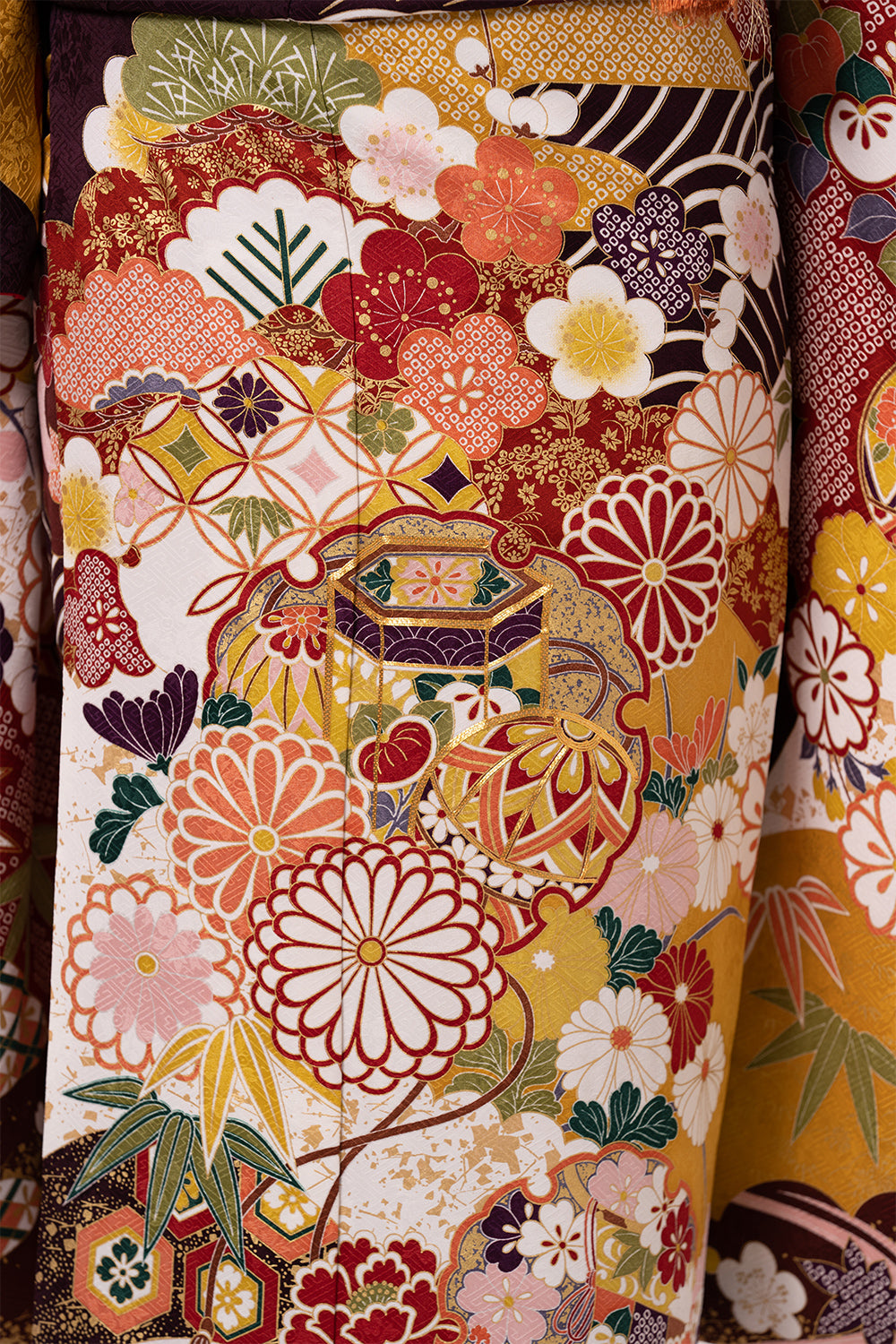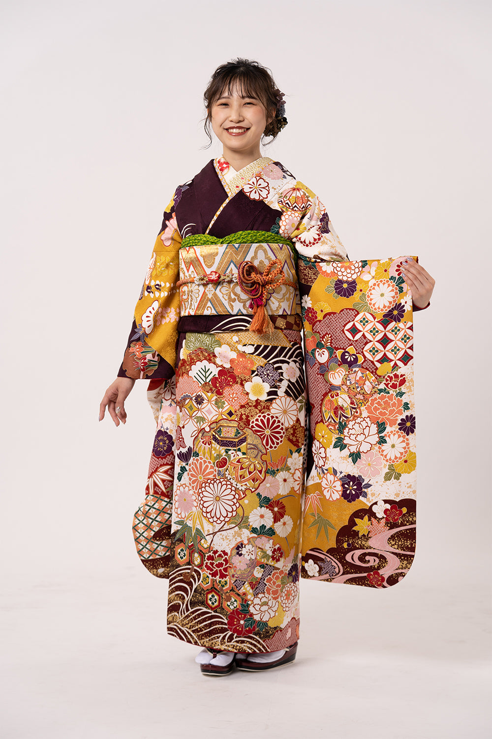 珍しい色味の中に、豪華に描かれた古典的な紋様が美しい振袖です。