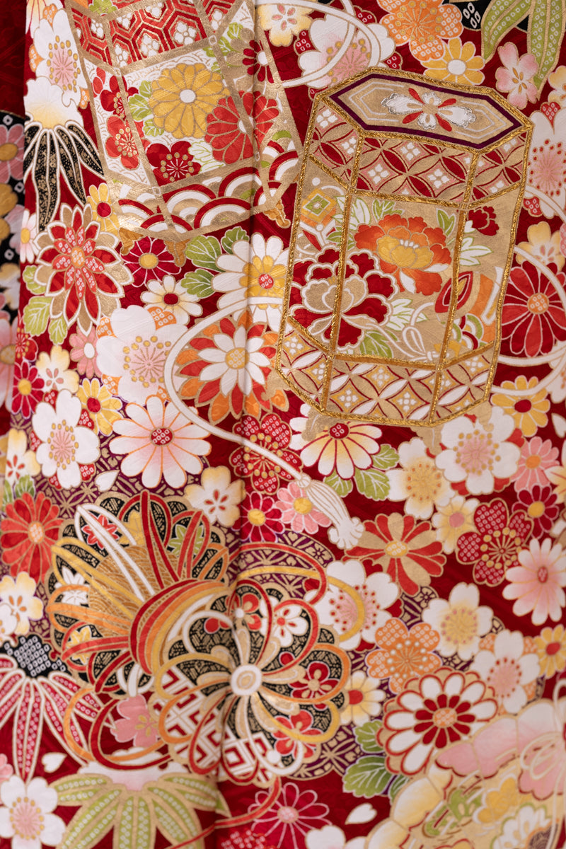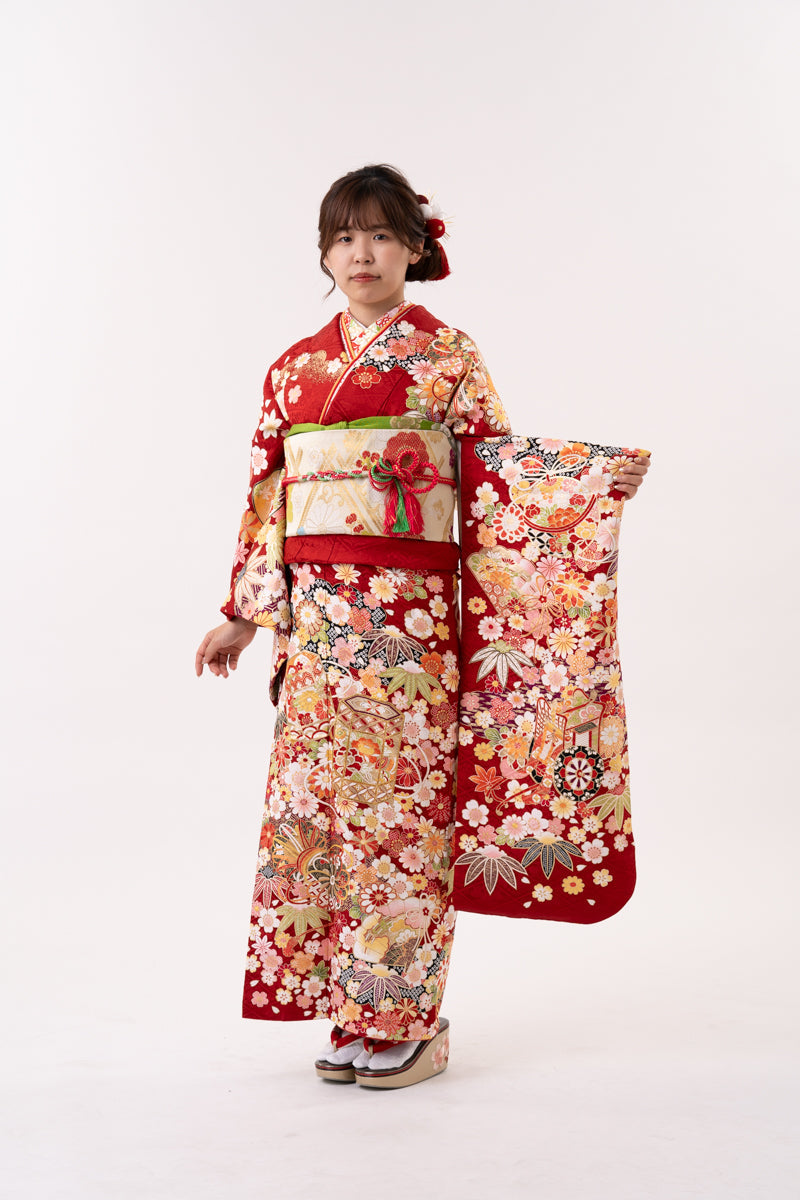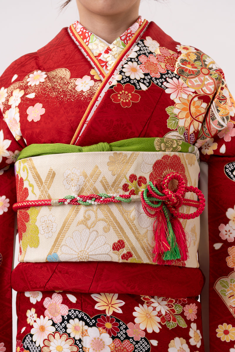 赤地に可愛らしい小花の花々が描かれた一枚。赤色と相性がいい抹茶色の帯揚げをポイントにコーディネート。