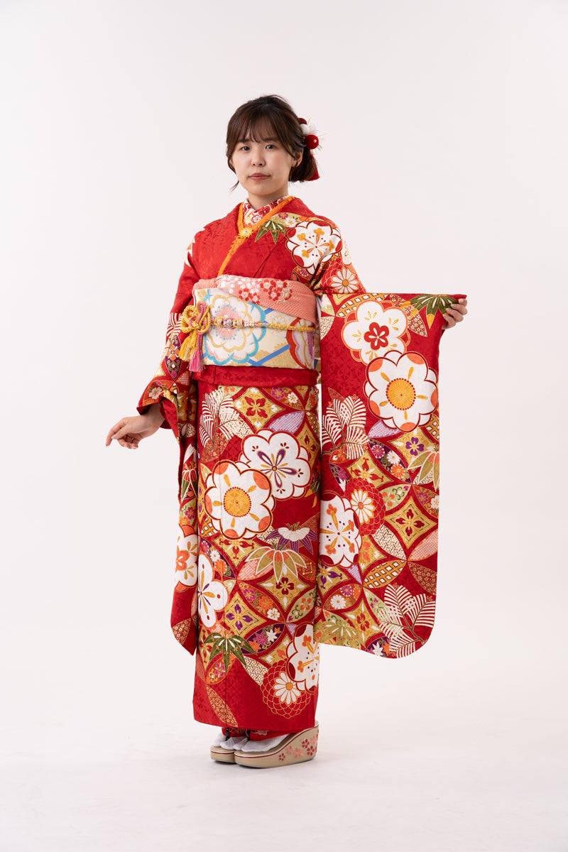 赤地に大きく可愛らしい梅が描かれたお振袖。小物にもパステルを取り入れて王道可愛い印象に。