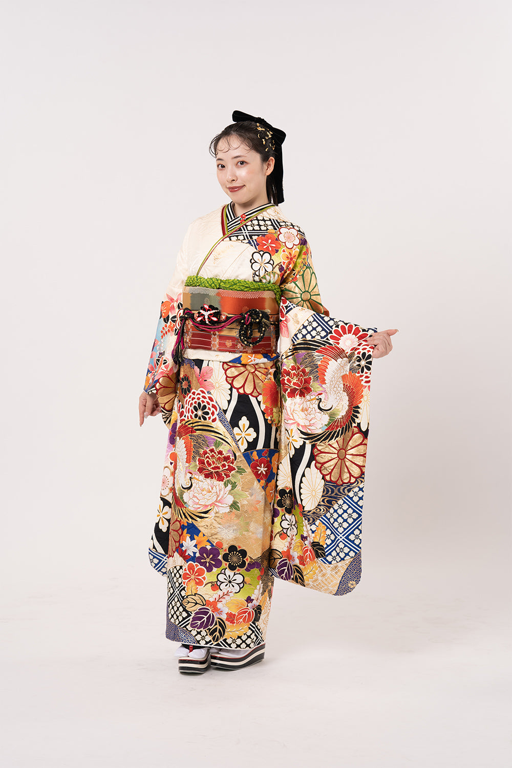 クリーム色に鶴や色とりどりの花々や紋様を描いた豪華絢爛な振袖です。