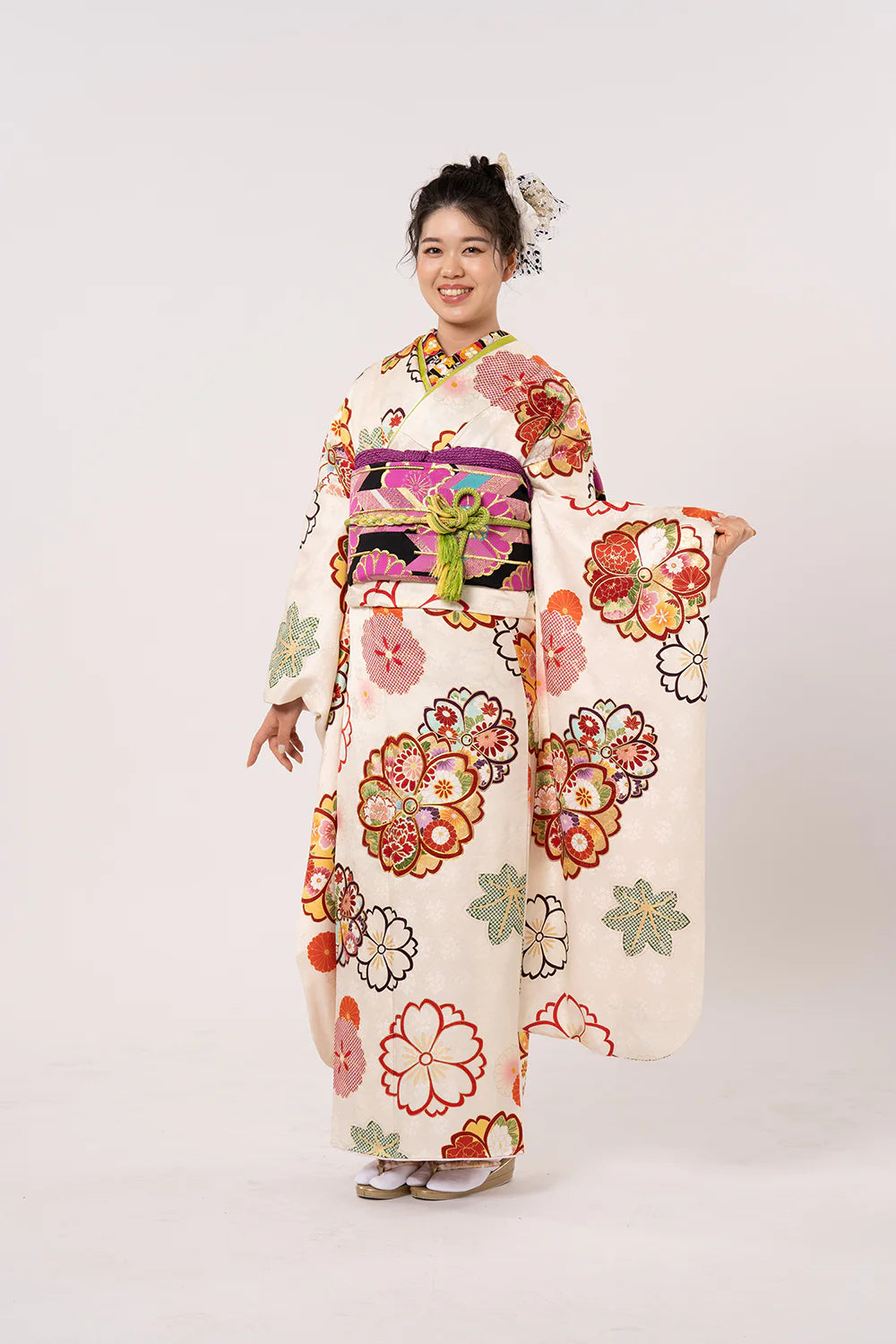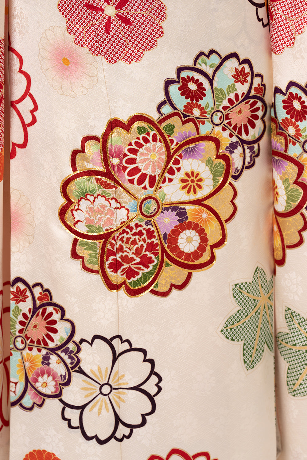 クリーム色に大胆に描かれた八重桜が特徴的な振袖です。