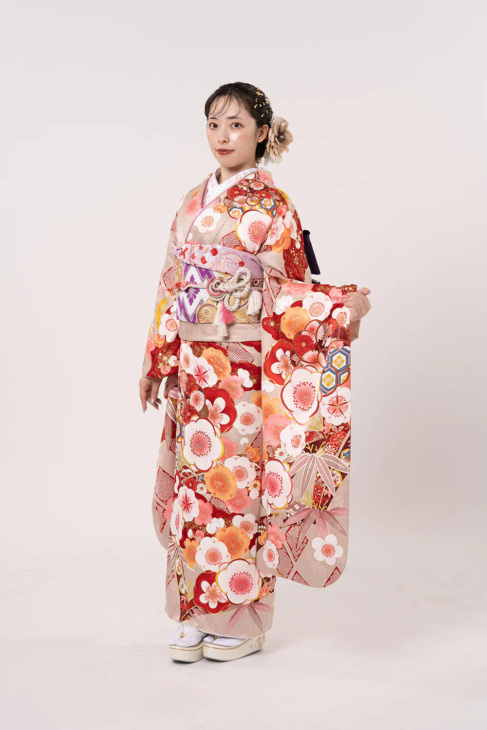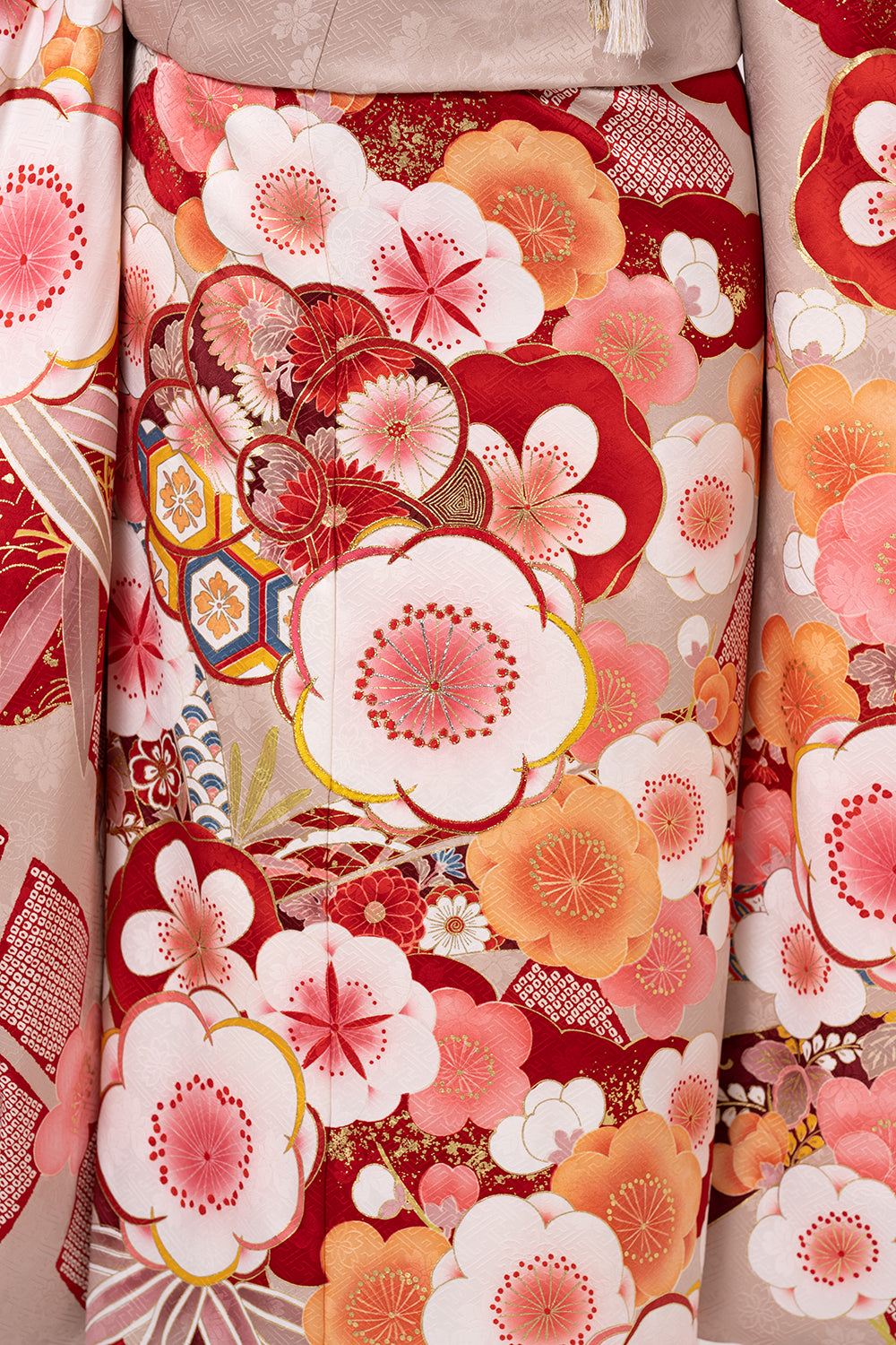 柔らかいピンクベージュに梅の柄が描かれた古典的な一枚です。