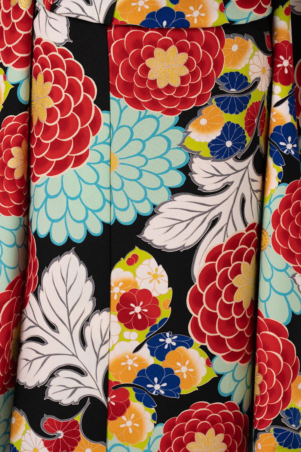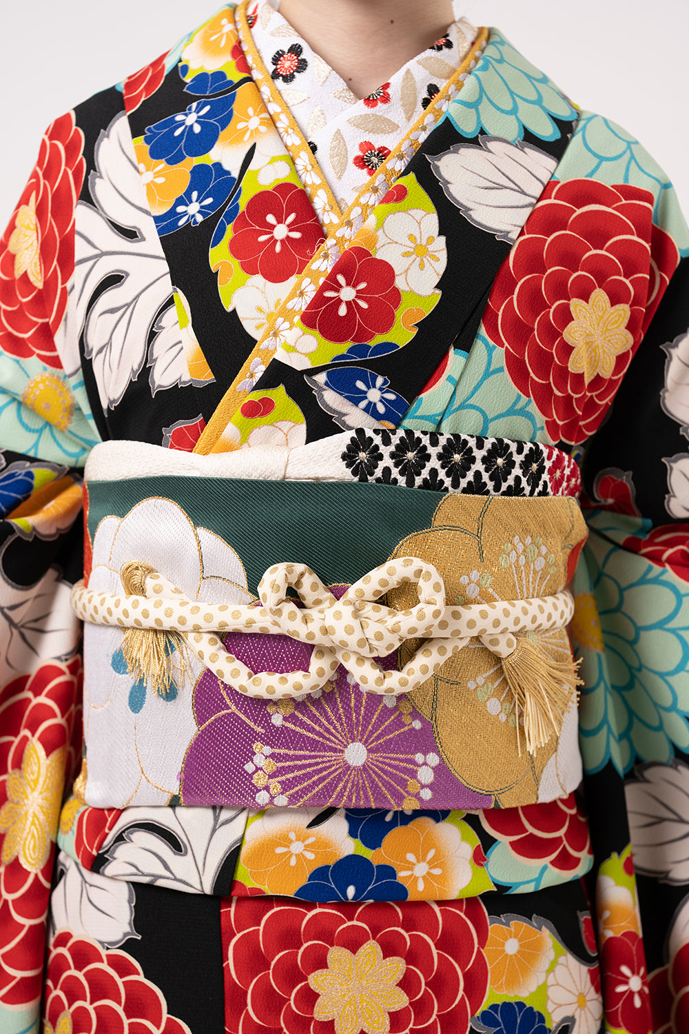 帯揚げのお花刺繍や帯締めのドットなど細かい所にも柄が入っています。